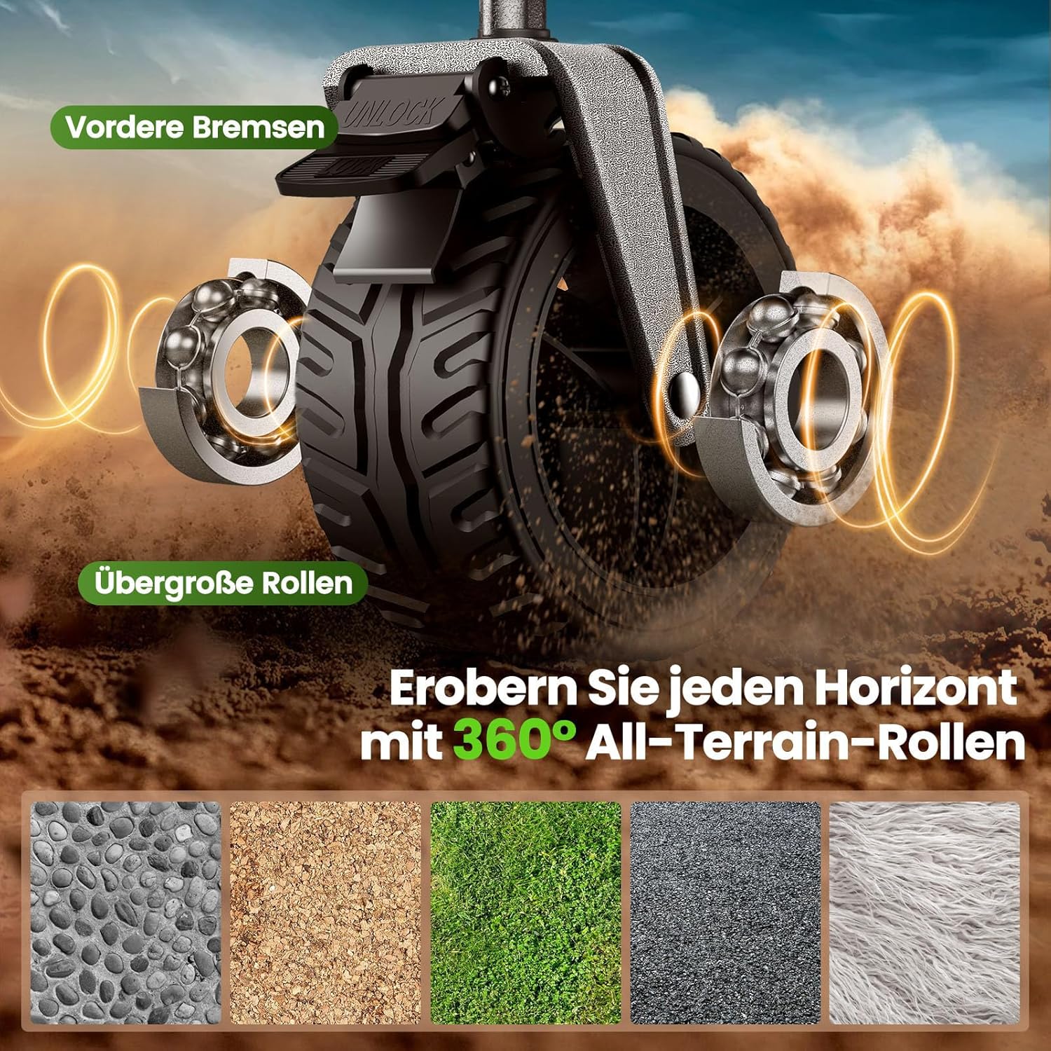 • 360°-Schwenk-All-Terrain-Räder mit Profil und Luftkern für jeden Untergrund