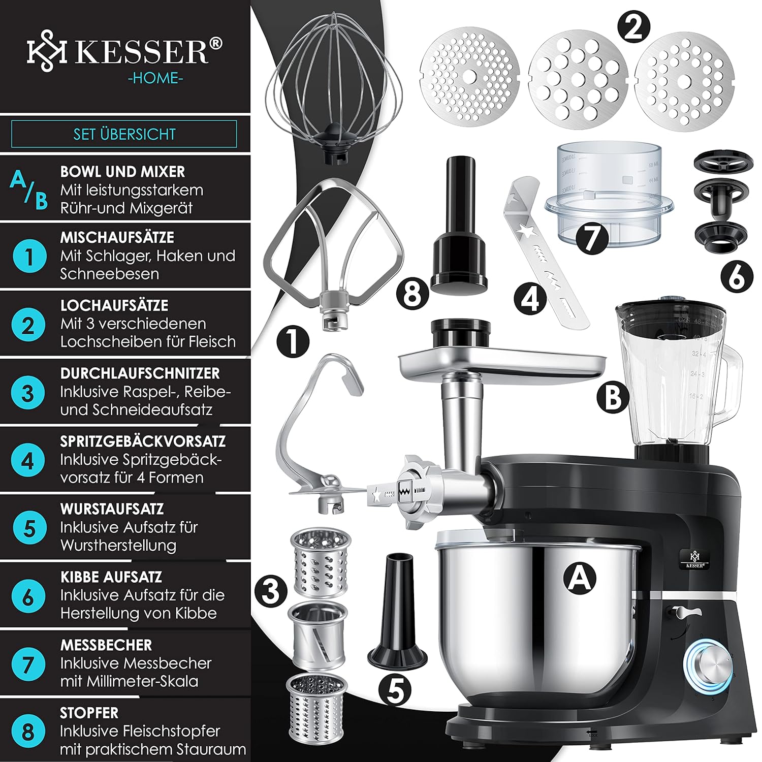 In jeder Küche, in der mit Leidenschaft gekocht wird, braucht es ein Gerät, das nicht nur verspricht, sondern hält. Die KESSER® 3-in-1 Universal Food Processor K-KM 3000 ist mehr als nur ein Küchenhelfer – sie ist das Herzstück einer modernen, leistungsfähigen Küche, in der frische Pasta, hausgemachter Apfelsaft, fluffiger Kuchenteig und aromatischer Hackfleisch in perfekter Balance zusammenkommen. Mit ihrer beeindruckenden Multifunktionalität, hochwertigen Verarbeitung und durchdachten Sicherheitssystemen erhebt diese Küchenmaschine den Alltag zum kulinarischen Erlebnis. Ob Großfamilie, passionierte Hobbyköchin oder ambitionierter Koch – mit der K-KM 3000 wird jedes Mahl zum Meisterwerk.