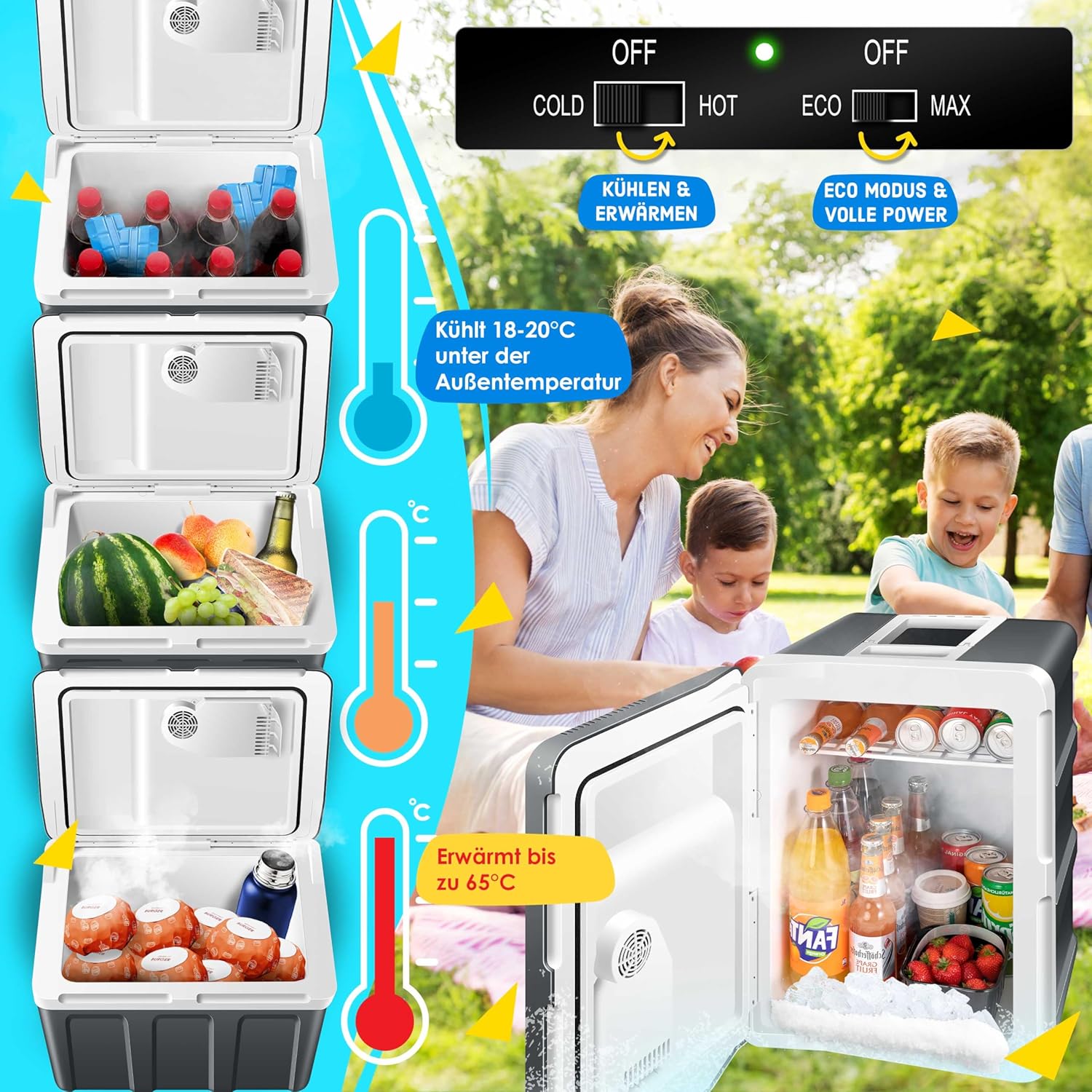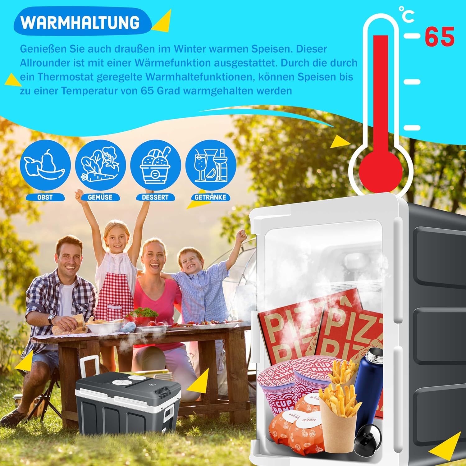 Besonders praktisch: Die Kühlbox kann sowohl kühlen als auch heizen. Im Kühlmodus sorgt sie für frische Lebensmittel, im Heizmodus hält sie warme Mahlzeiten bis zu 65 °C – ideal für vorbereitete Speisen, die nicht kalt werden dürfen. Ob Sie ein warmes Mittagessen aus dem Büro mitnehmen oder das Abendbrot für die Kinder auf einer längeren Reise schonend warmhalten möchten – die präzise Thermostatsteuerung garantiert konstante Temperaturen ohne Temperaturschwankungen.