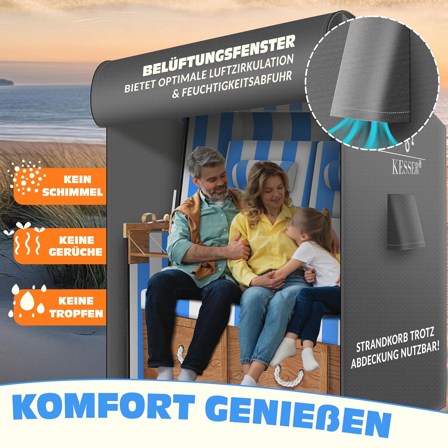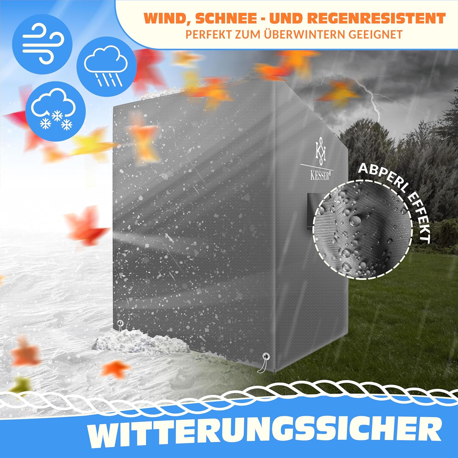 Schützen Sie Ihren Strandkorb das ganze Jahr über mit dem KESSER® Premium Schutzcover – der robuste Allwetter-Schild aus 600D Oxford Fabric, der selbst starken Regen, Schnee und UV-Strahlung mühelos trotzt. Dank intelligenter Lüftungsöffnungen entweicht Feuchtigkeit nach außen, verhindert Schimmelbildung und unangenehme Gerüche, während der hochwertige Reißverschluss und der verstellbare Kordelzug mit Aluminiumösen für sicheren Halt…