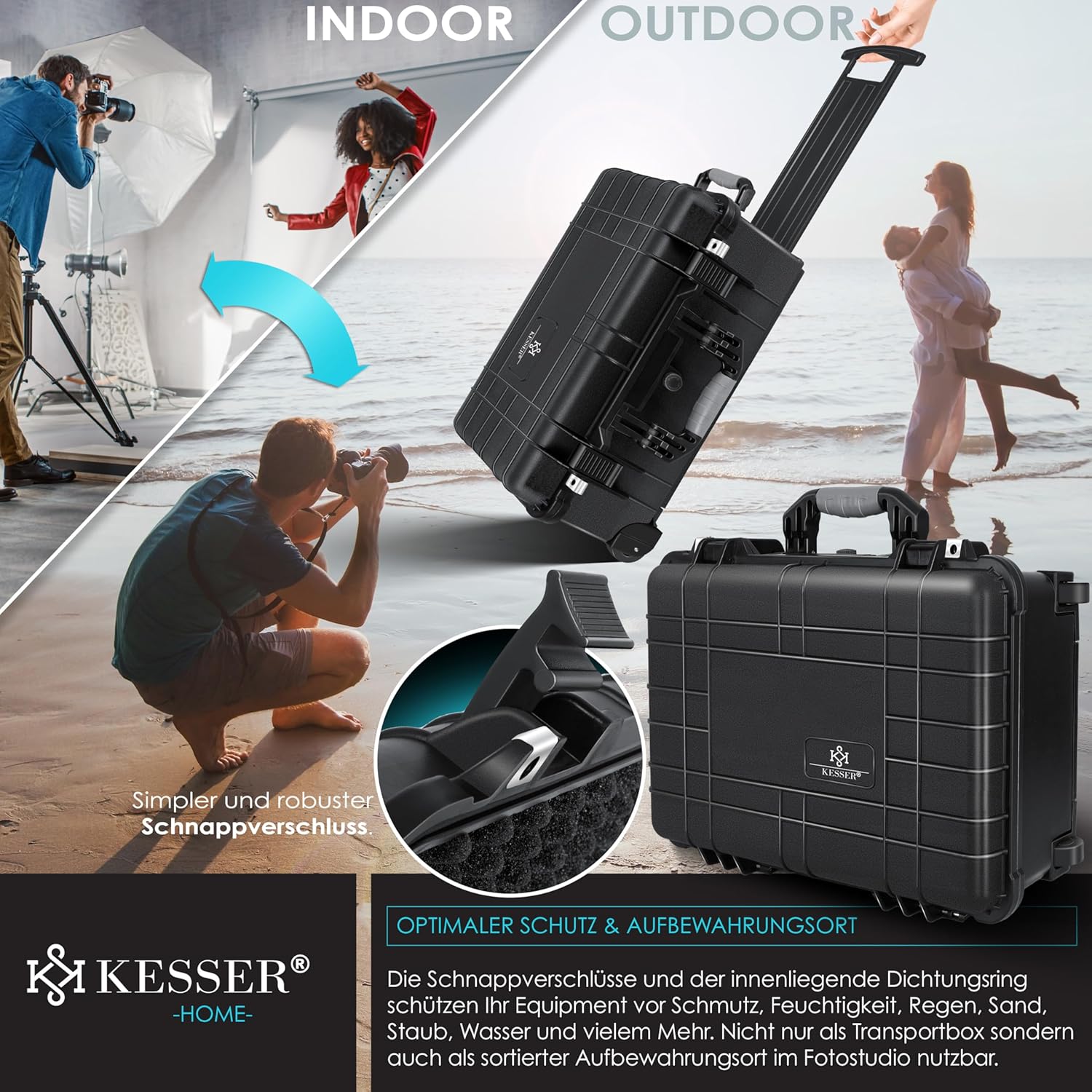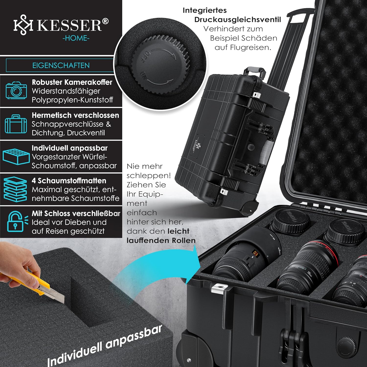 Wenn es um die Sicherheit Ihrer hochwertigen Kameras, Objektive und Zubehör geht, lässt echte Profi-Qualität keine Kompromisse zu. Das KESSER® Camera Case ist nicht einfach nur ein Transportbehältnis – es ist ein durchdachtes, hochwertiges Schutzsystem, das speziell für anspruchsvolle Fotografen entwickelt wurde, die unterwegs sind, sei es auf Reisen, bei Outdoor-Shootings oder im Studio. Hergestellt aus robusten Materialien, ausgestattet mit innovativen Sicherheits- und Komfortfunktionen und präzise konzipiert für maximale Anpassungsfähigkeit, bietet dieses Hardshell-Gehäuse den zuverlässigsten Schutz, den Ihre Ausrüstung verdienen.