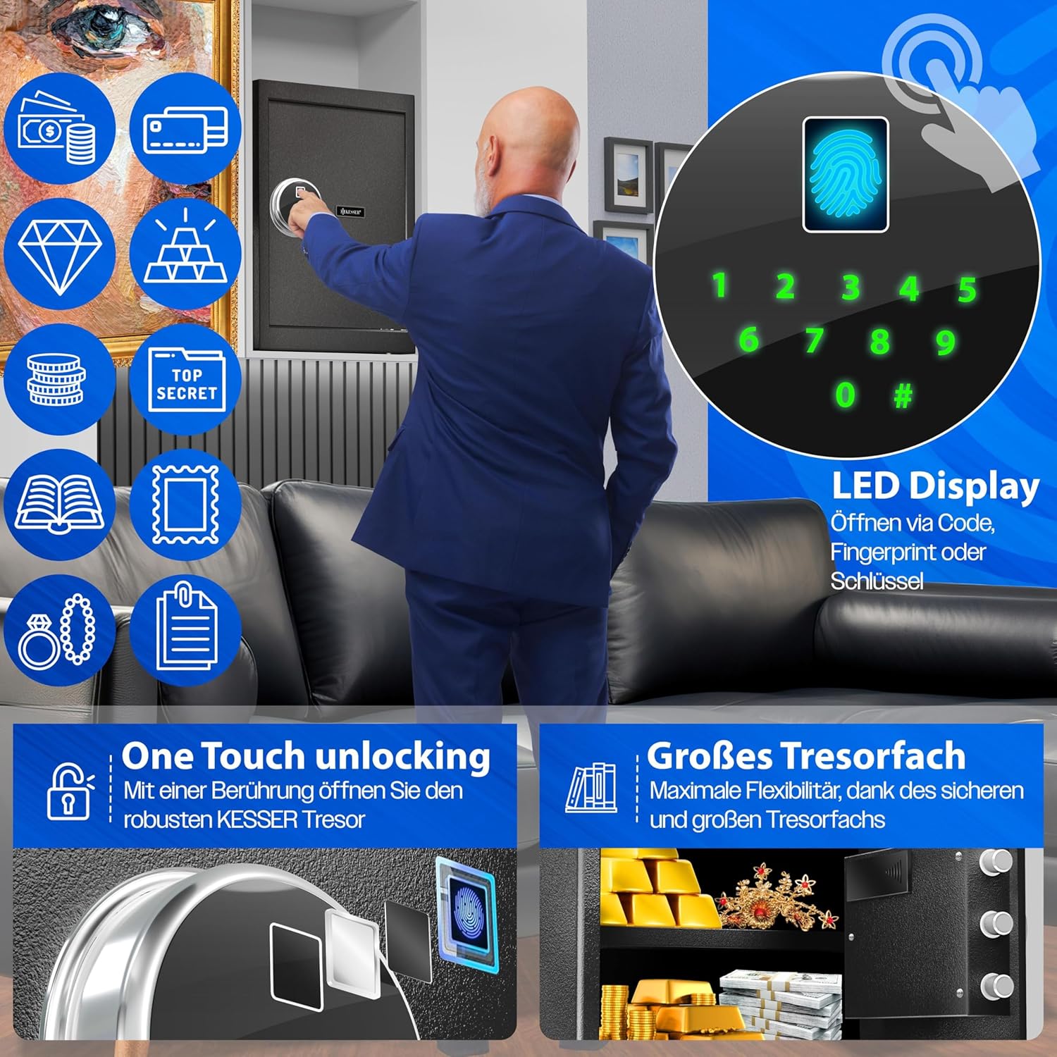 KESSER® Elektronischer Safe mit Fingerabdruck & Schlüssel M | Mit Notstrom-Batterie | Elektronischer Tresor | 3x Doppelbolzenverriegelung | Boden-Wand-Safe | Möbeltresor | Panzerschrank