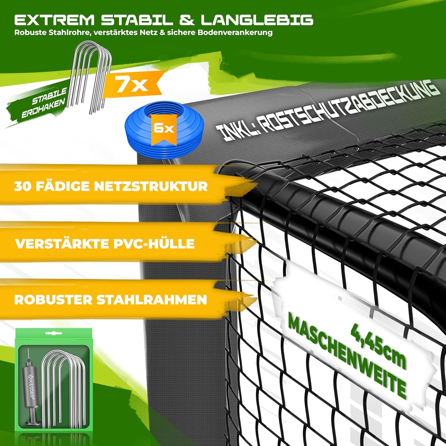 Die Netzbespannung besteht aus einem speziell gefertigten, reißfesten Polyethylen-Gewebe, das gezielt für den harten Freizeit- und Sportgebrauch entwickelt wurde. Im Gegensatz zu Standard-Netzen reißt es nicht beim ersten harten Schuss und verliert auch nach monatelanger Sonneneinstrahlung nicht an Festigkeit. Die Maschen sind eng genug, um den Ball sicher aufzufangen, gleichzeitig aber so offen, dass Regenwasser schnell abfließen kann und sich keine Staunässe bildet.