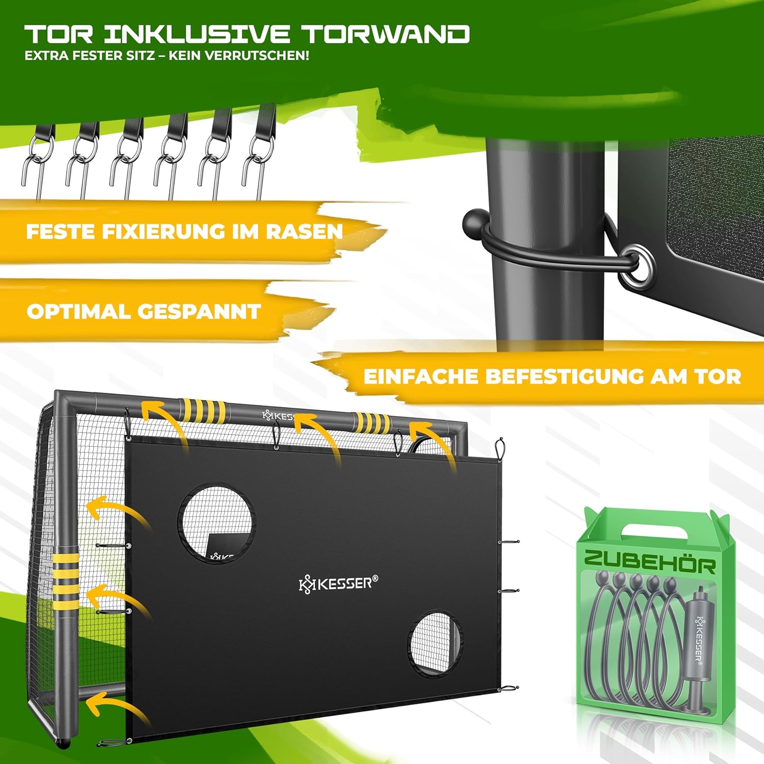 Entwickelt für den ganzjährigen Einsatz im Freien, überzeugt das KESSER® Fußballtor durch seine robuste Stahlkonstruktion, die UV-beständige Netzbespannung und die sichere Bodenverankerung. Es ist kein gewöhnliches Garten-Spielzeug, sondern ein professionell konstruiertes Sportgerät im FIFA-Format, das auch starken Schüssen und widrigen Wetterbedingungen standhält. Die mitgelieferte Torwand verwandelt das Tor zudem in ein vollwertiges Trainingssystem – ideal für Technikübungen, Dribbling und präzises Schießen.