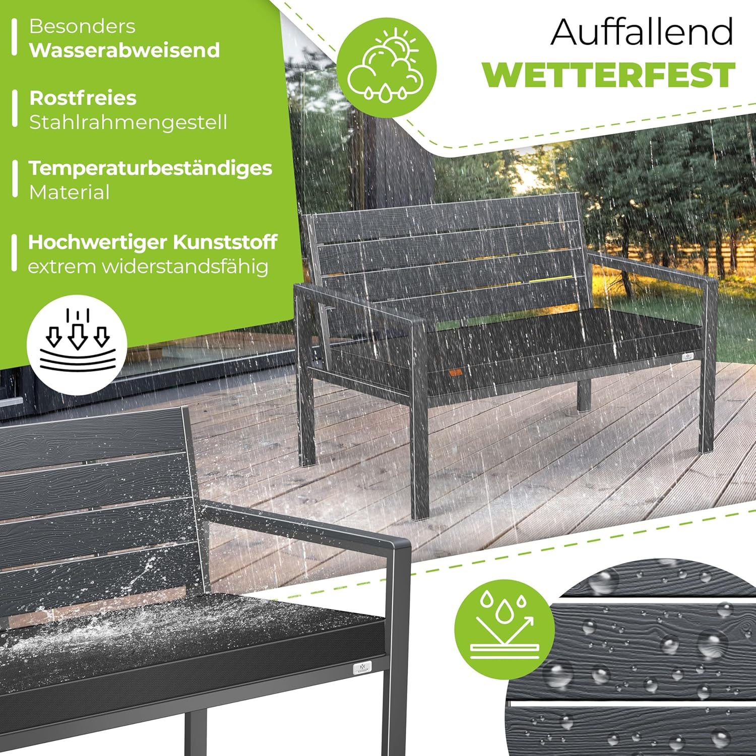 Die KESSER® Gartenbank ist für das ganze Jahr gemacht – nicht nur für die sonnigen Monate. Das hochwertige Kunststoffmaterial ist extrem witterungsbeständig und hält Temperaturen von -30 °C bis +60 °C stand. Ob im heißen Sommer, im nassen Herbst oder im frostigen Winter – die Bank behält ihre Funktion und Optik.