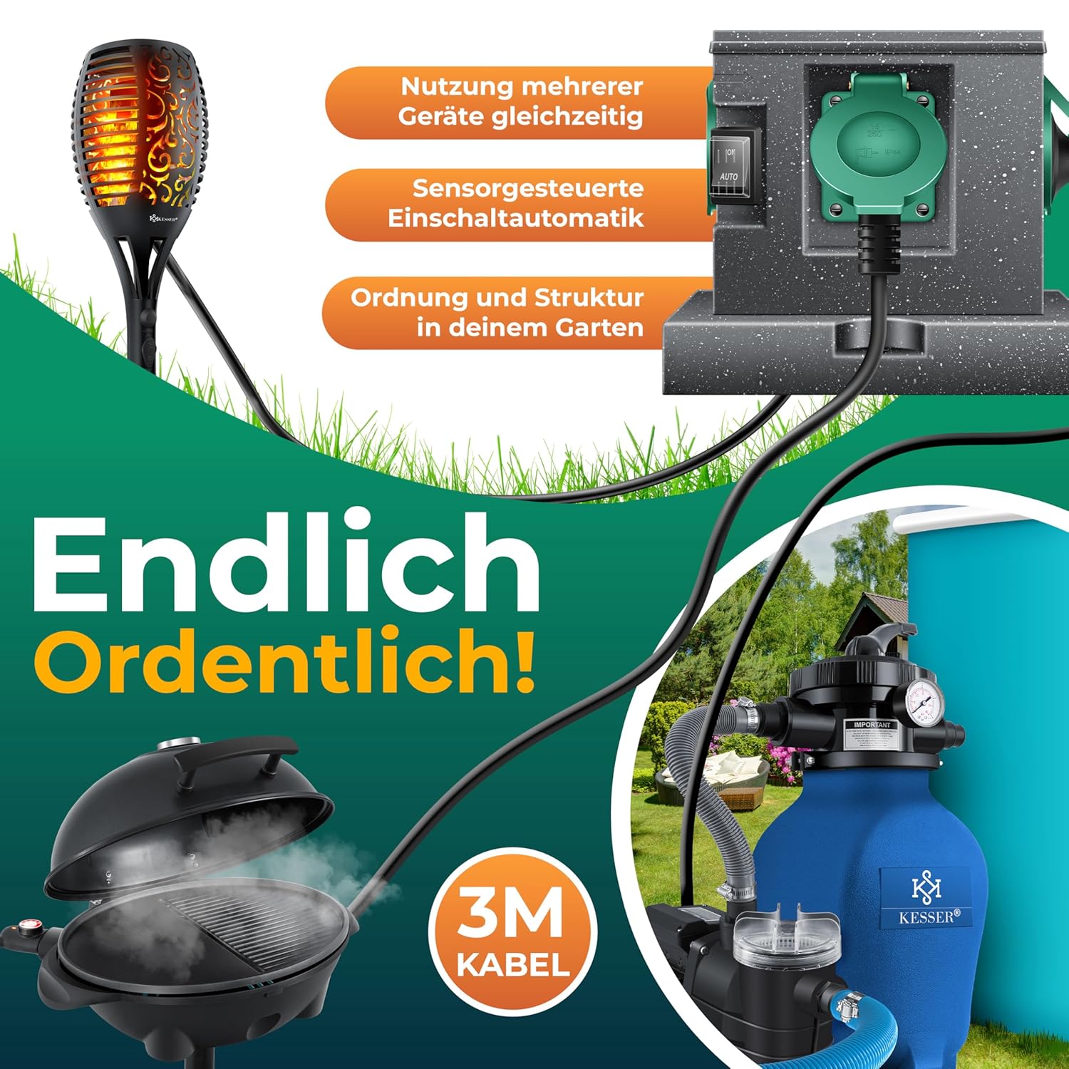 Die KESSER® Gartendose in Steinoptik ist mehr als ein technisches Gerät – sie ist ein Beitrag zu einem schöneren, sichereren und komfortableren Leben im Freien. Sie schenkt Ihnen Zeit, Ruhe und die Freiheit, Ihren Garten so zu nutzen, wie Sie es sich wünschen. Ob für die Familie, die Gäste oder einfach für sich selbst – diese intelligente Outdoor-Steckdose macht jeden Moment im Grünen ein wenig behaglicher, ein wenig heller, ein wenig magischer. Investieren Sie in Qualität, Sicherheit und Design – mit der KESSER® Gartendose, Ihrem zuverlässigen Partner für einen lebendigen Garten.