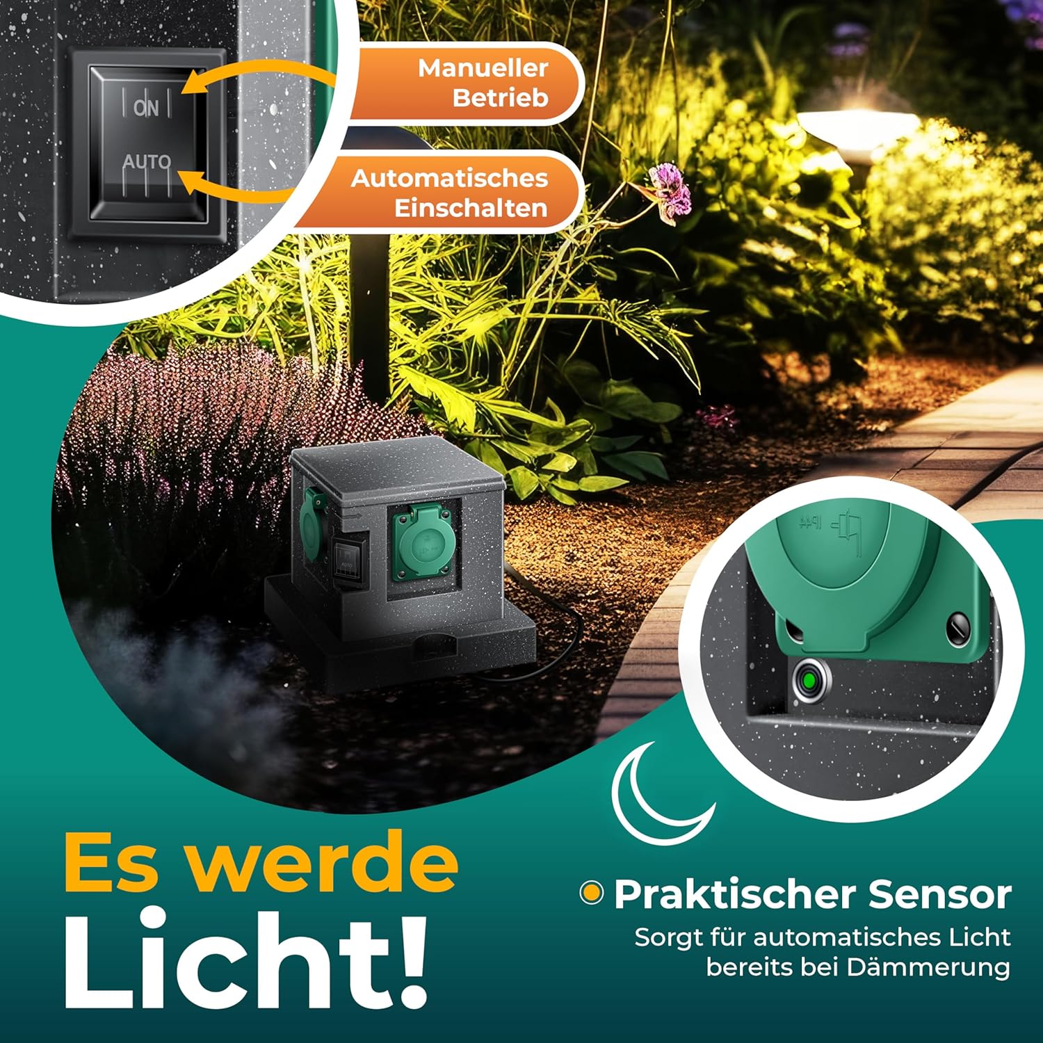 Die KESSER® Gartendose ist nicht nur schön, sondern vor allem komfortabel im täglichen Gebrauch. Die 2-Modus-Schaltung (ON/Auto-Dämmerung) ermöglicht es Ihnen, je nach Bedarf zwischen manuellem und automatischem Betrieb zu wechseln. Im „ON“-Modus schalten Sie Ihre Geräte jederzeit manuell ein – ideal für gelegentliche Nutzung wie Gartenpartys oder das Arbeiten mit Elektrowerkzeugen. Im „Auto“-Modus übernimmt die integrierte Dämmerungssensorik die Steuerung: Bei Einbruch der Dämmerung schaltet die Dose automatisch ein, bei Tagesanbruch wieder aus.