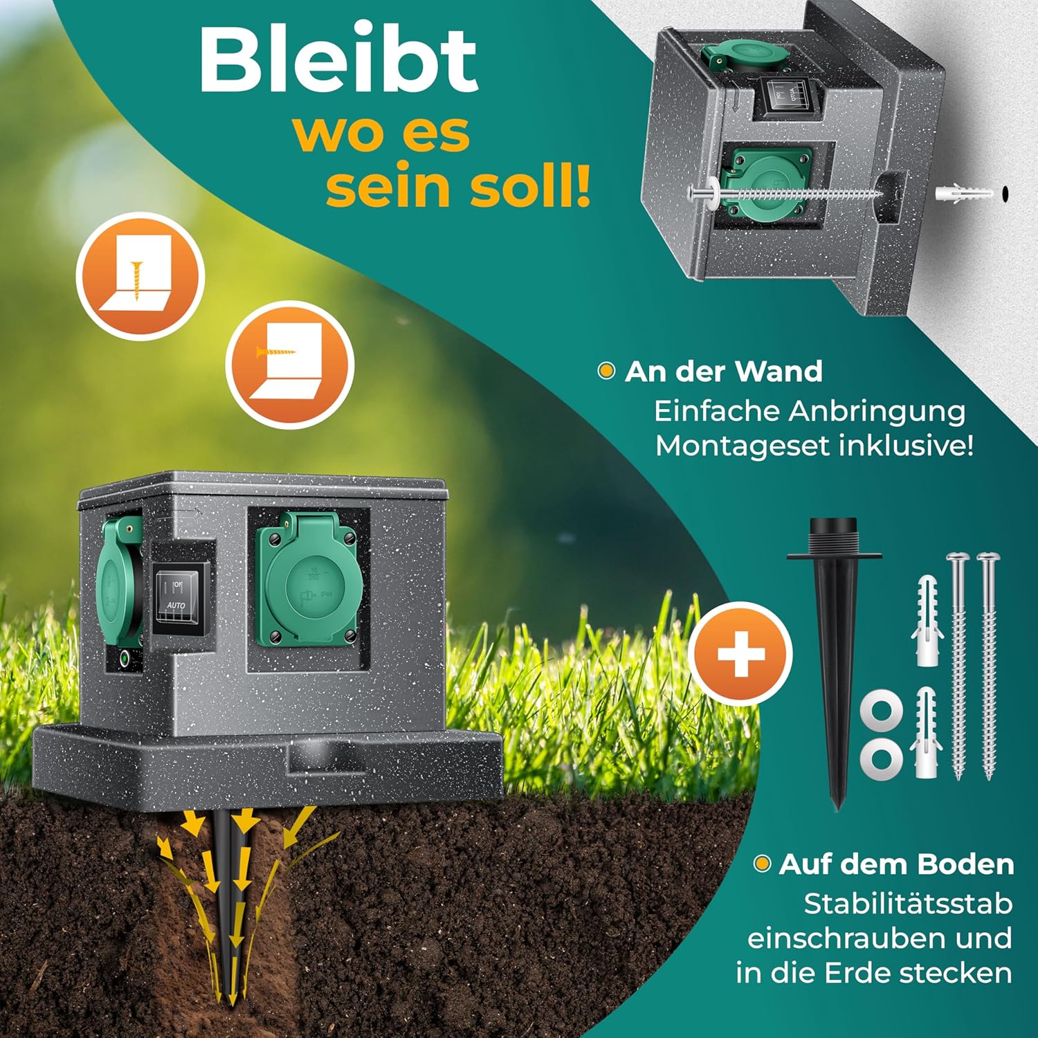 Wenn Sie die Dose lieber an einer Hauswand, einem Gartenschuppen oder einer Pergola befestigen möchten, sind im Lieferumfang passende Schrauben und Dübel enthalten. Die Montage erfolgt werkzeuglos in wenigen Minuten – kein Elektriker notwendig. Die Dose lässt sich problemlos in bestehende Stromkreise integrieren und ist für den Anschluss an handelsübliche 230-V-Netze geeignet.