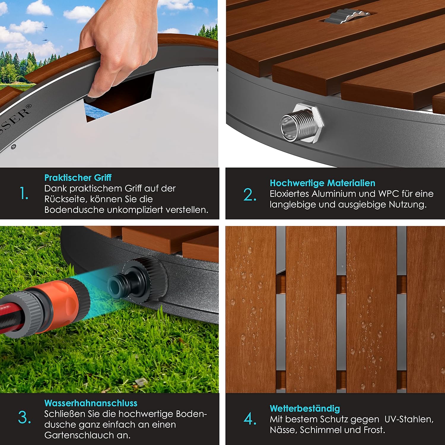 Premium-Gartendusche mit Fußbedienung – 70 cm runder Design-Brunnen, höhenverstellbar bis 4 m, aus Aluminium/WPC, rutschfest – ideal für Outdoor, Camping und Wellness-Oasen