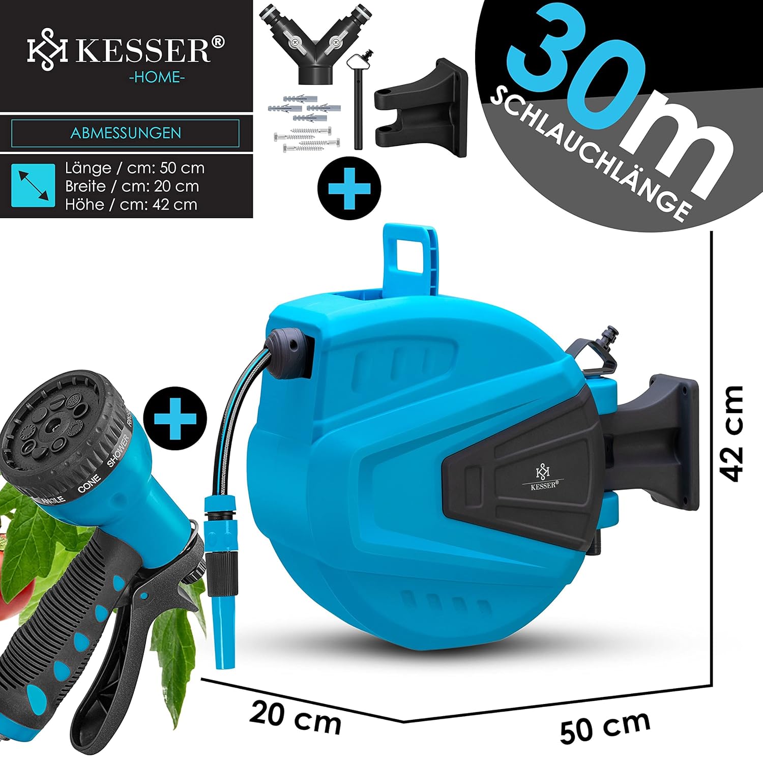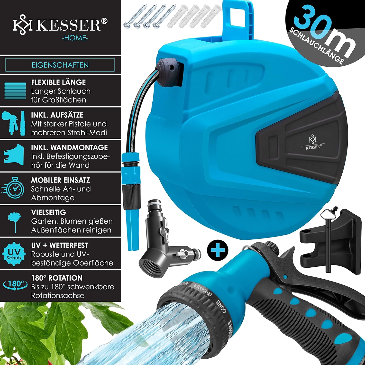 Wasserspaß ohne Grenzen – mit dem Kesser® Gartenschlauchaufroller 30 m + 2 m Zusatzschlauch und 9-Funktionen Handbrause! Dank automatischer Schlauchrückholung und Zentrifugalbremse ziehen Sie den Schlauch mühelos auf die gewünschte Länge – er rollt sich nach Gebrauch blitzschnell von selbst zurück. Sparen Sie Zeit und Rückenschmerzen: Die 180° schwenkbare Wandhalterung macht lästiges Kurbeln und Bücken…