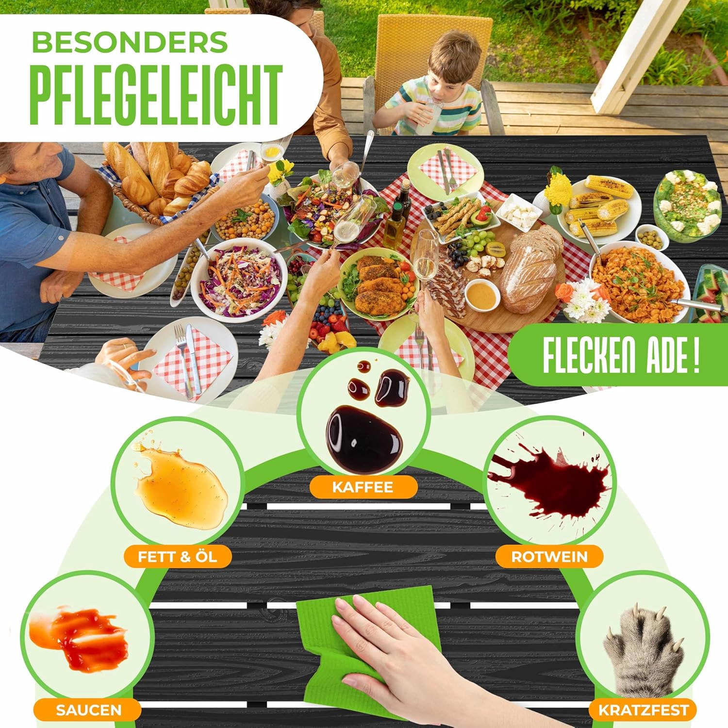 Die Tischplatte ist aus HDPE (High-Density Polyethylene) gefertigt – einem besonders dichten und widerstandsfähigen Kunststoff, der in puncto Haltbarkeit oft Holz überlegen ist. Das Material ist vollständig wasserabweisend, saugt keine Feuchtigkeit auf und behält seine Form auch bei langfristiger Sonneneinstrahlung. Im Gegensatz zu Naturholz splittert es nicht, verzieht sich nicht und benötigt keine regelmäßige Ölung oder Imprägnierung.