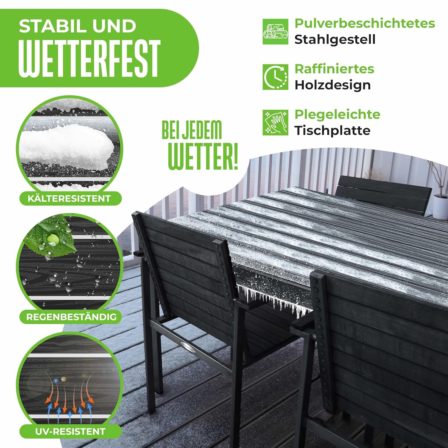 Dank seiner robusten Konstruktion aus pulverbeschichtetem Stahl und einem Tischplatten-Design aus HDPE-Kunststoff im natürlichen Holzdekor überzeugt dieser Tisch nicht nur optisch, sondern auch durch seine außergewöhnliche Widerstandsfähigkeit gegenüber den Elementen. Er ist speziell dafür entwickelt, das ganze Jahr über im Garten, auf der Terrasse oder sogar auf dem Balkon zu stehen – ohne Schäden durch Regen, UV-Strahlung oder Temperaturschwankungen davonzutragen. Mit Platz für bis zu sechs Personen bietet er ausreichend Raum für die ganze Familie oder Gäste und wird so zum unverzichtbaren Begleiter für alle saisonalen Highlights im eigenen Außenbereich.