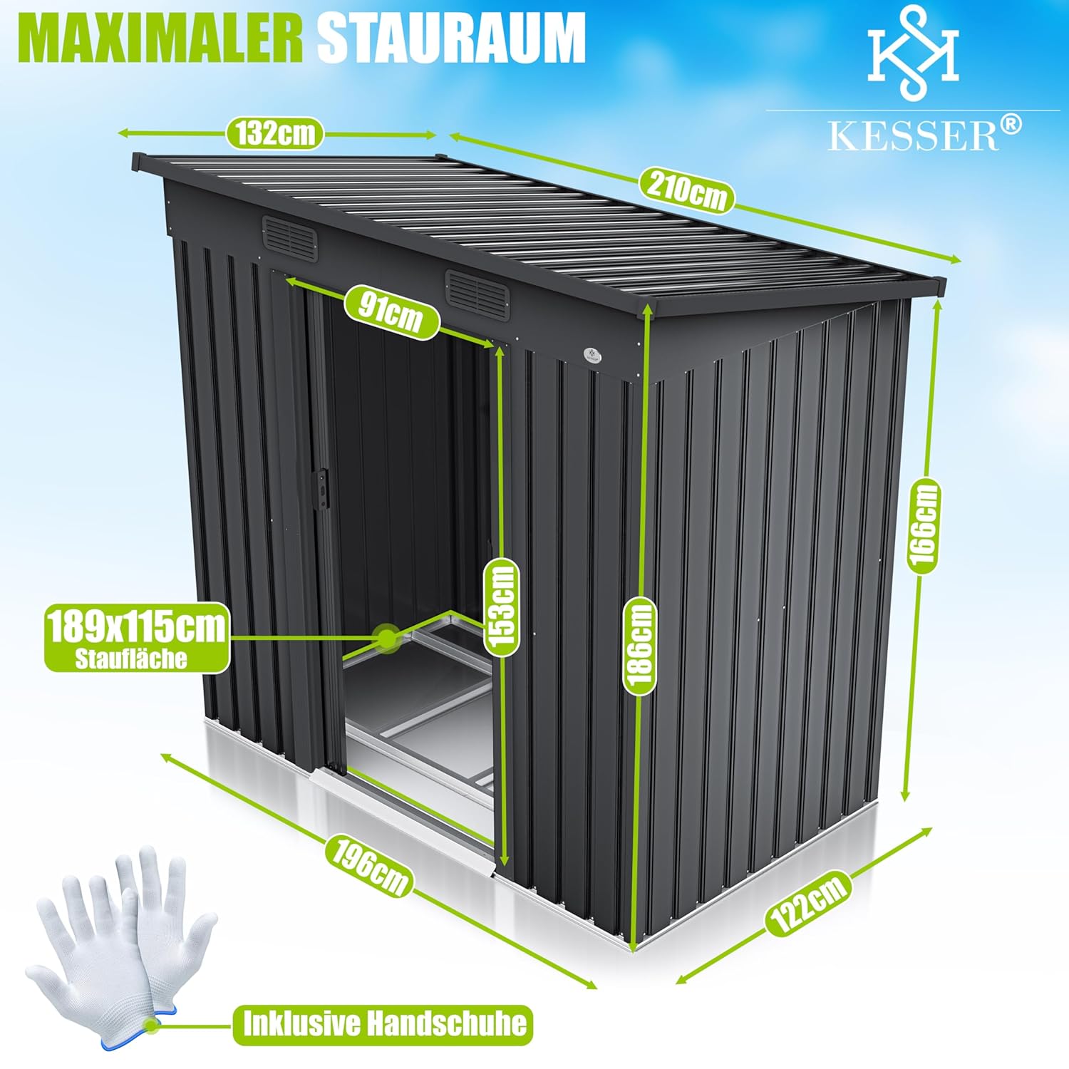 Maximieren Sie Ihren Gartenplatz mit dem KESSER® Tool Shed L – dem robusten Alleskönner aus wetterfestem Metall, der mit seinen 196 x 122 x 180 cm jede Menge Stauraum für Fahrräder, Rasenmäher, Gartenmöbel und mehr bietet. Die beiden 77 cm breiten Schiebetüren öffnen sich spielend leicht – sogar bei Schnee dank des mitgelieferten Bodenprofils –…