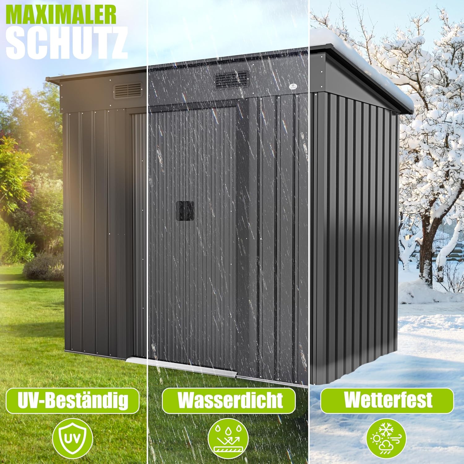Familien schätzen die kindersichere Aufbewahrung von Spielzeug, das im Freien schnell verloren gehen oder Schaden nehmen kann. Mit diesem Schuppen haben Sie endlich einen sicheren Ort, an dem Bobby-Cars, Sandkastensets, Springseile und Outdoor-Spiele trocken und vor Diebstahl geschützt aufbewahrt werden. Gleichzeitig lässt sich der hintere Bereich für Werkzeuge und chemische Produkte nutzen – getrennt und sicher verschlossen.