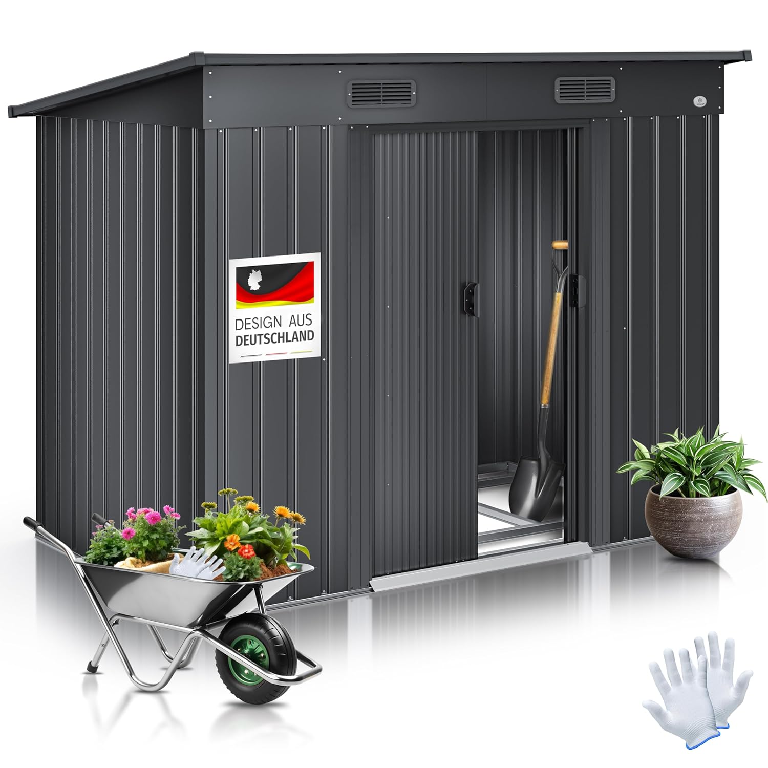 Die wartungsarme Oberfläche aus beschichtetem Stahl erfordert nur gelegentliches Abwischen mit einem feuchten Tuch, um Staub und Schmutz zu entfernen. Im Gegensatz zu Holzschuppen entfällt das jährliche Streichen, Imprägnieren oder Schützen vor Pilzbefall. Die Lüftungsöffnungen sind so positioniert, dass sie nicht verstopfen, und die Schiebetüren laufen auch bei niedrigen Temperaturen problemlos.