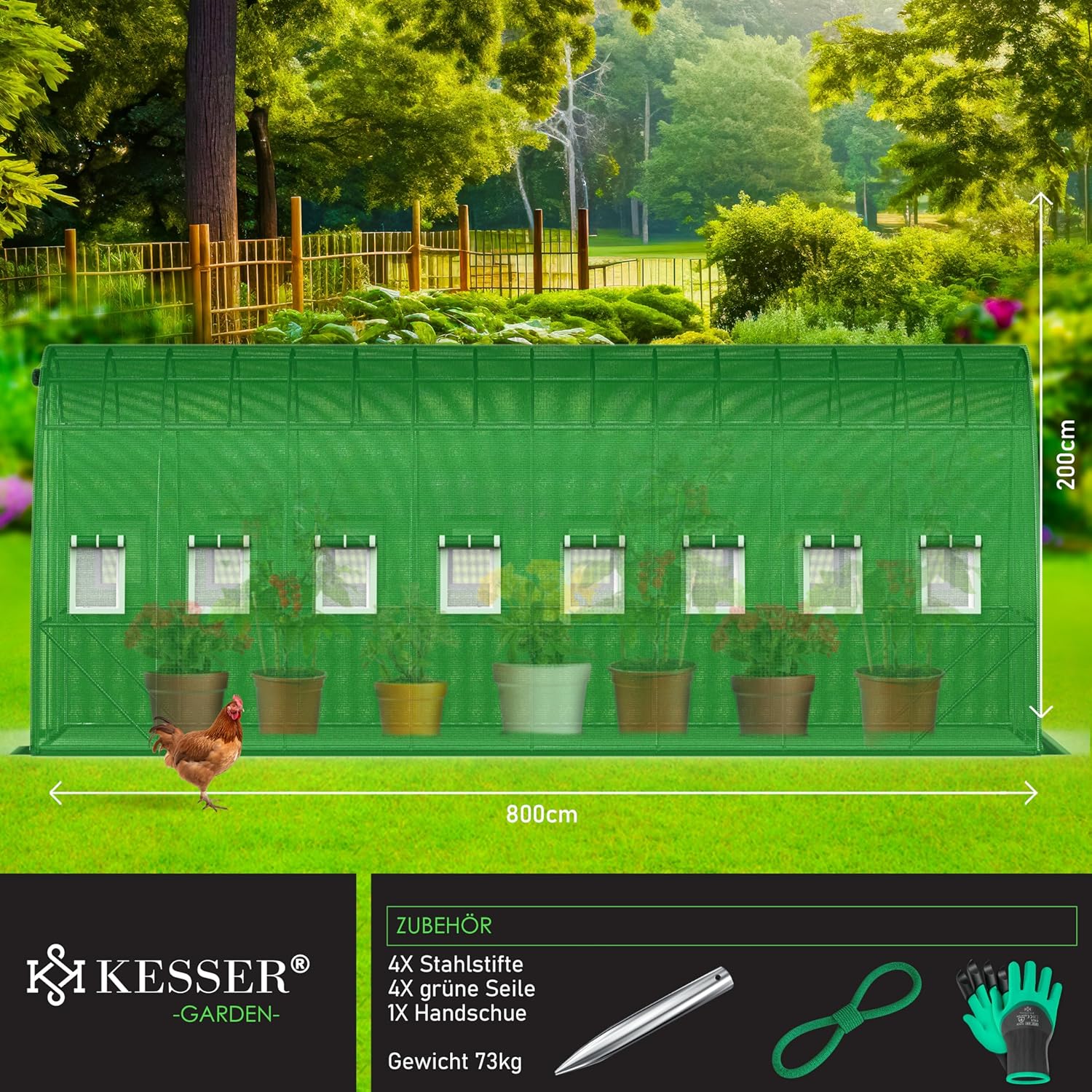 Ein Garten ist mehr als nur ein Fleck Erde – er ist ein Ort der Ruhe, der Familie, des Wachstums und der Freude. Für alle, die ihre Leidenschaft für das Gärtnern in vollen Zügen ausleben möchten, bietet das KESSER® Stable Foil Greenhouse die ideale Verbindung aus robuster Technik, cleverem Design und langjähriger Zuverlässigkeit. Mit einer beeindruckenden Größe von 800 x 300 cm und einer Raumhöhe von bis zu 200 cm schafft dieser Poly-Tunnel optimale Bedingungen für Tomaten, Gurken, Paprika, Kräuter und vieles mehr – und das ganzjährig, bei jedem Wetter.