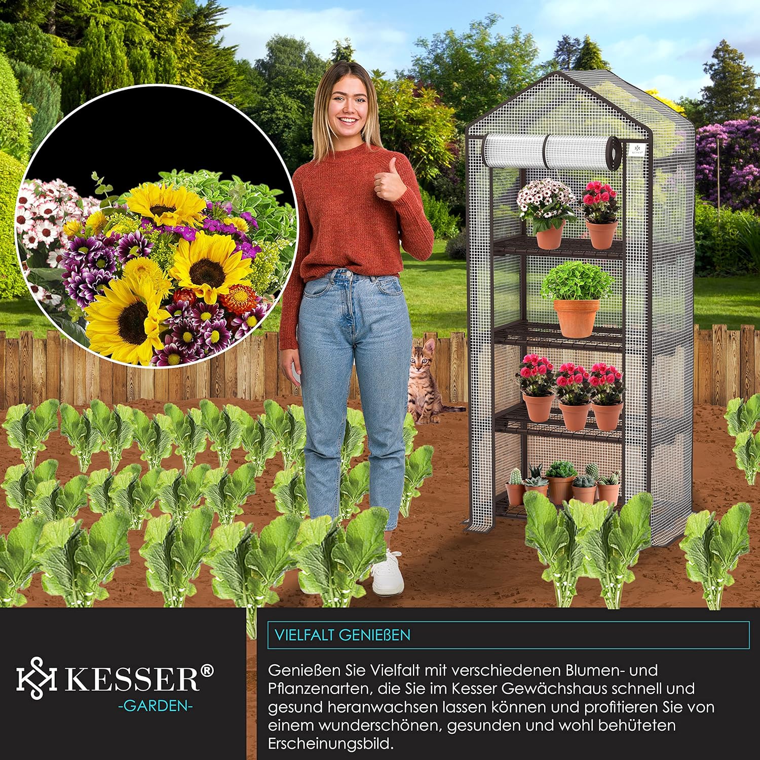 Das KESSER® Premium Gewächshaus ist mehr als nur ein Schutzbehältnis – es ist ein mikroklimatischer Wachstumsbeschleuniger, der durch intelligente Belüftung, optimale Sonnennutzung und robuste Materialien das ganze Jahr über ideale Bedingungen schafft. Ganz gleich, ob Sie als Hobbygärtner frische Kräuter für die Familienküche ziehen, als Urban Gardener auf engstem Raum maximale Erträge erzielen oder Ihren Kindern den faszinierenden Prozess des Pflanzenwachstums näherbringen möchten – dieses Gewächshaus wird zum Mittelpunkt grüner Lebensfreude.