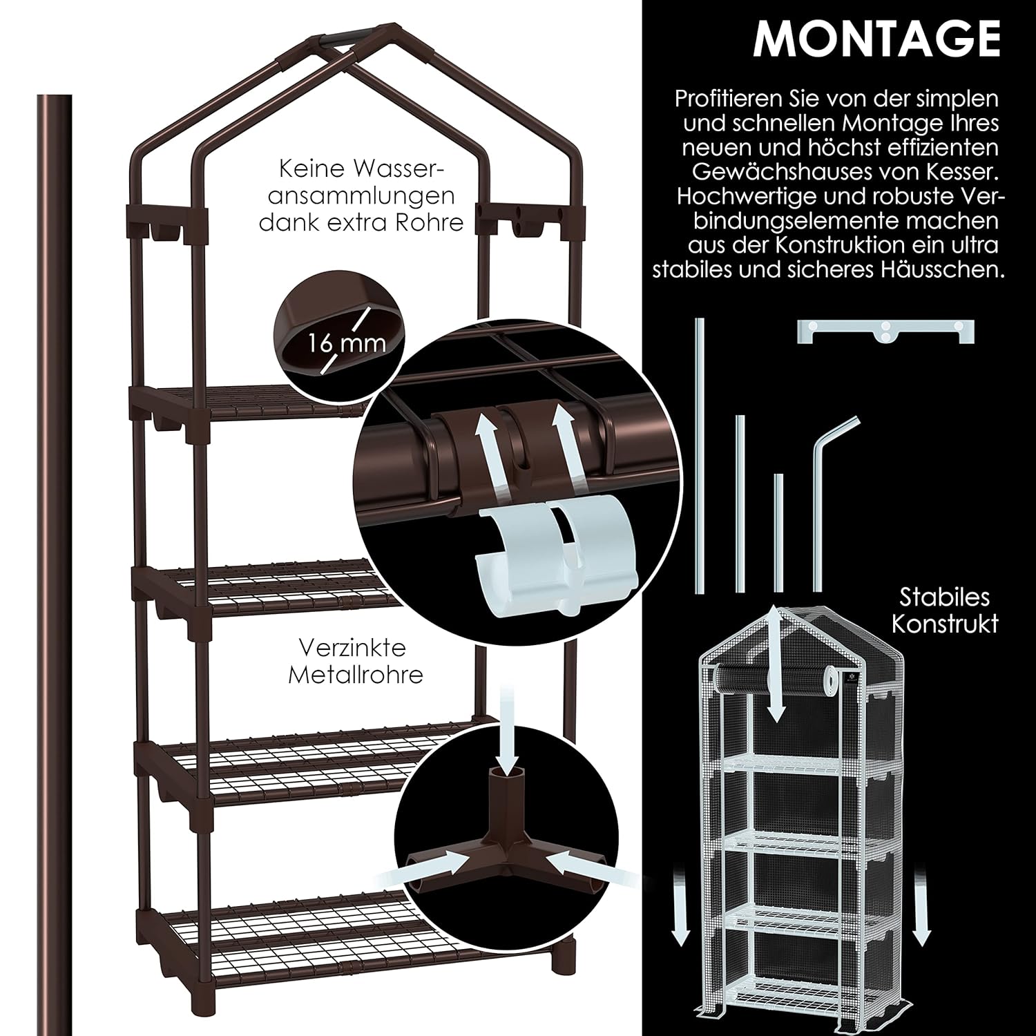 Der Aufbau des KESSER® Premium Gewächshauses ist in unter 30 Minuten erledigt – ohne Werkzeug, ohne komplizierte Anleitung, ohne Frustration. Alle Rohre sind farblich codiert und die Verbindungen nummeriert, sodass selbst unerfahrene Nutzer das System schnell und sicher zusammenstecken können. Die klare, bebilderte Montageanleitung führt Schritt für Schritt durch den Aufbau, während die robusten Kunststoffverbinder ein sicheres Einrasten garantieren.