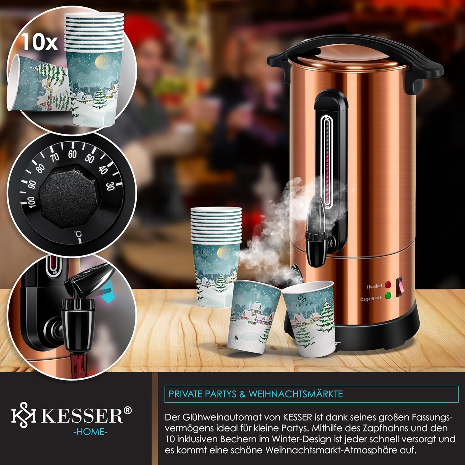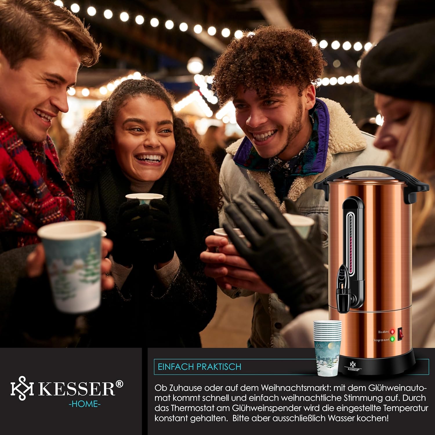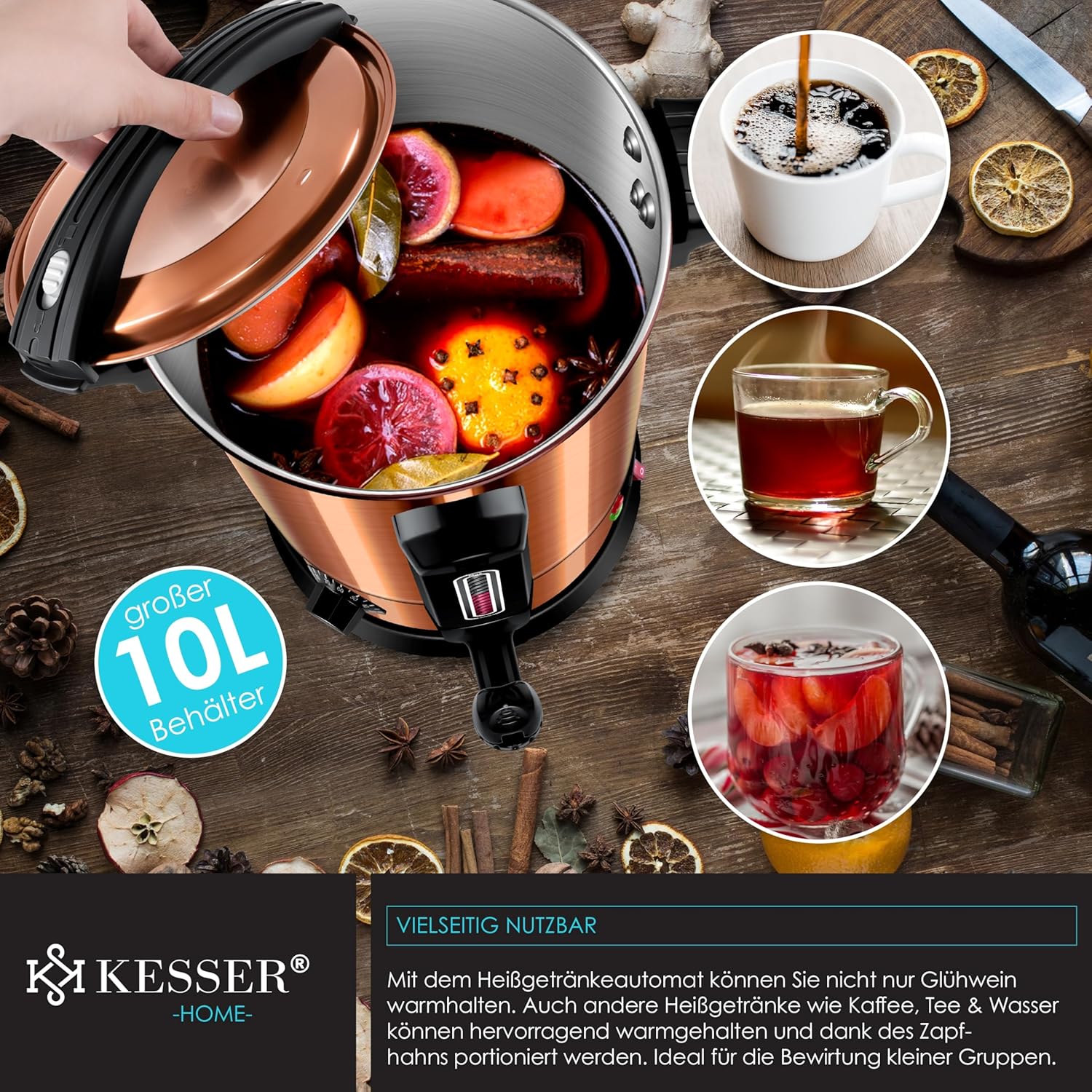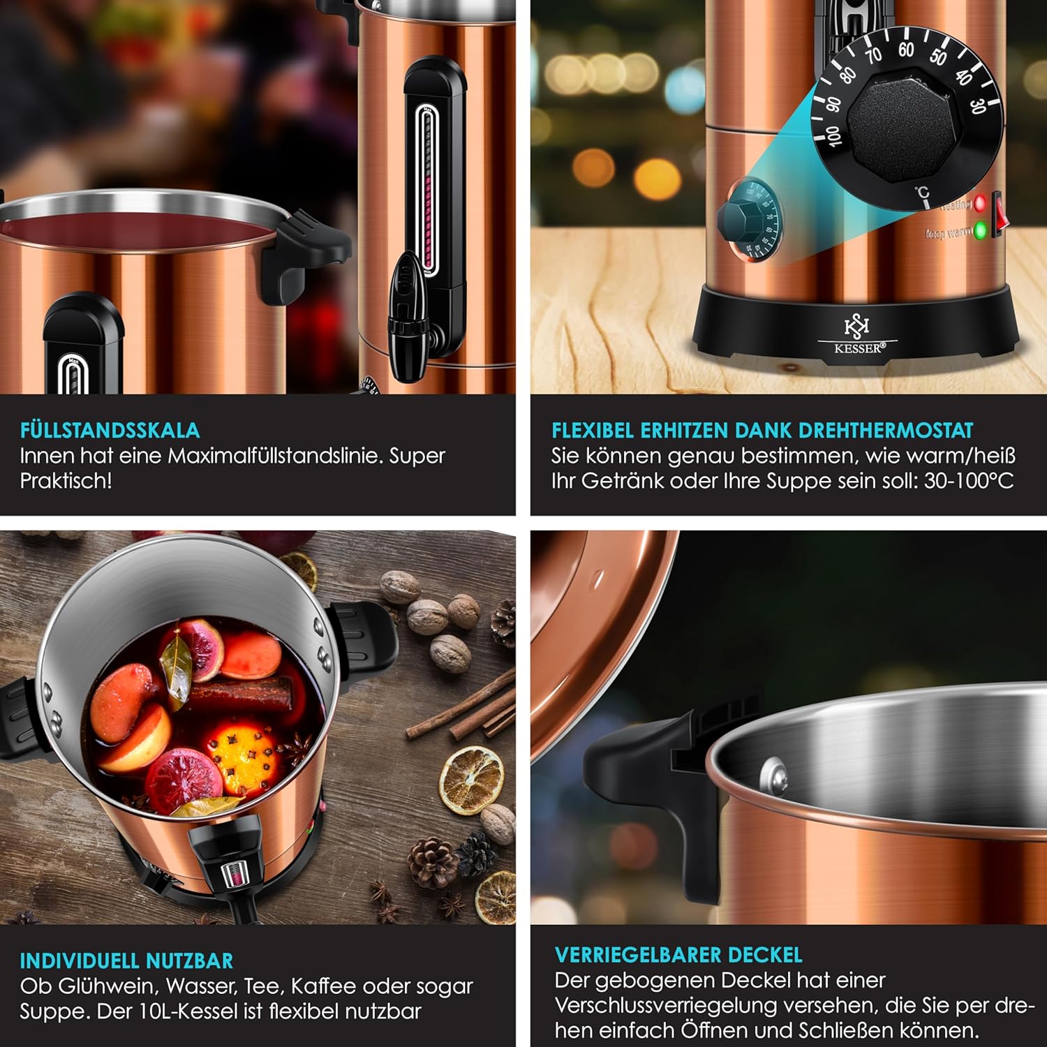 Entwickelt mit deutscher Präzision und ausgestattet mit professionellen Funktionen in Gastronomie-Qualität, ist der KESSER® Mulled Wine Kettle die ideale Lösung für alle, die Wert auf Qualität, Sicherheit und ästhetisches Design legen. Mit einem Fassungsvermögen von 10 Litern, einem präzisen Thermostat, einem praktischen Auslaufhahn und einem edlen Kupfer-Finish, das jeden Raum oder Stand erhellt, bietet dieses Gerät nicht nur technische Überzeugung, sondern schafft auch eine einladende Atmosphäre. Es ist mehr als nur ein Gerät – es ist ein Garant für gemeinsame Lacher, warme Hände und wohltuende Aromen.