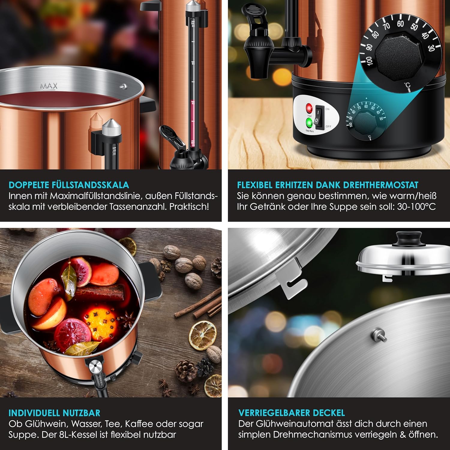 Der KESSER® Mulled Wine Kettle 8L überzeugt durch seine beeindruckende Vielseitigkeit. Mit einem Fassungsvermögen von 8 Litern bietet er genügend Platz, um Getränke für mittelgroße Gruppen zuzubereiten – sei es für eine private Weihnachtsfeier mit der Familie, einen Vereinsabend oder einen Stand auf dem Weihnachtsmarkt. Der integrierte Heizkörper mit 1800 Watt Leistung sorgt für ein schnelles und gleichmäßiges Erhitzen, ohne dass das Getränk verbrennt oder seine Aromen verliert.