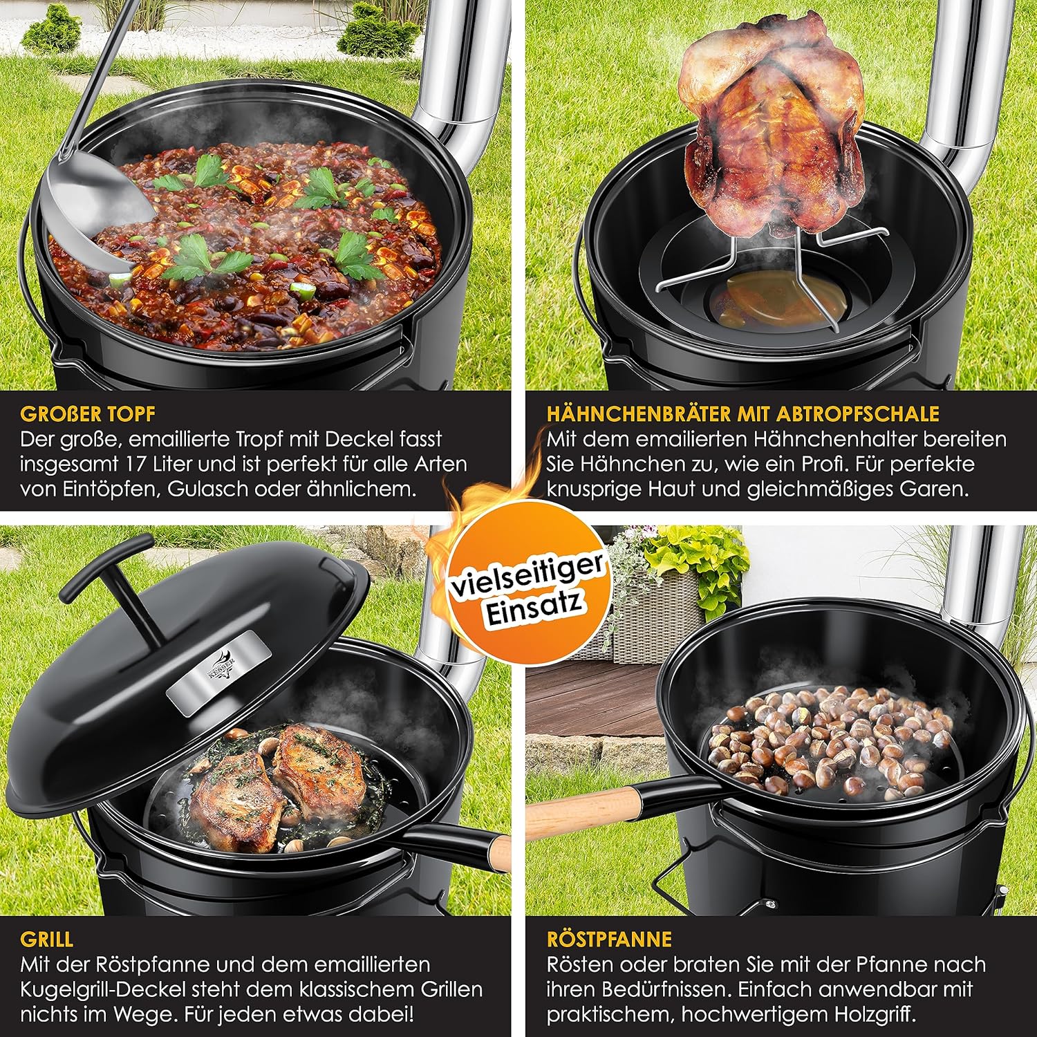 Die Stärke der KESSER® Goulashkanone liegt in ihrer beeindruckenden Vielseitigkeit. Mit einem Fassungsvermögen von 17 Litern im emaillierten Hauptkessel und einem zusätzlichen 8-Liter-Brat-/Grilltopf eignet sie sich für die unterschiedlichsten Zubereitungsarten. Ob Sie einen herzhaften Eintopf für 15 Personen brauen, einen dampfenden Kessel Glühwein für die Weihnachtsmarktatmosphäre auf dem Hof zaubern oder ein saftiges Hähnchen mit gleichmäßiger Bräune zaubern möchten – dieses Multitalent meistert jede Herausforderung.
