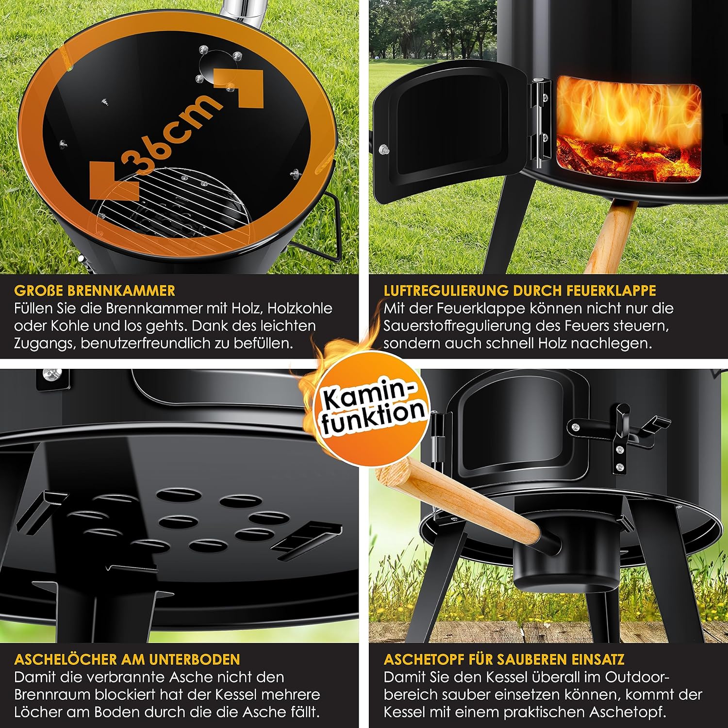 • Lieferumfang: Kessel mit Deckel, Grillrost, Hähnchenbräter, Ascheschale, Bedienungsanleitung