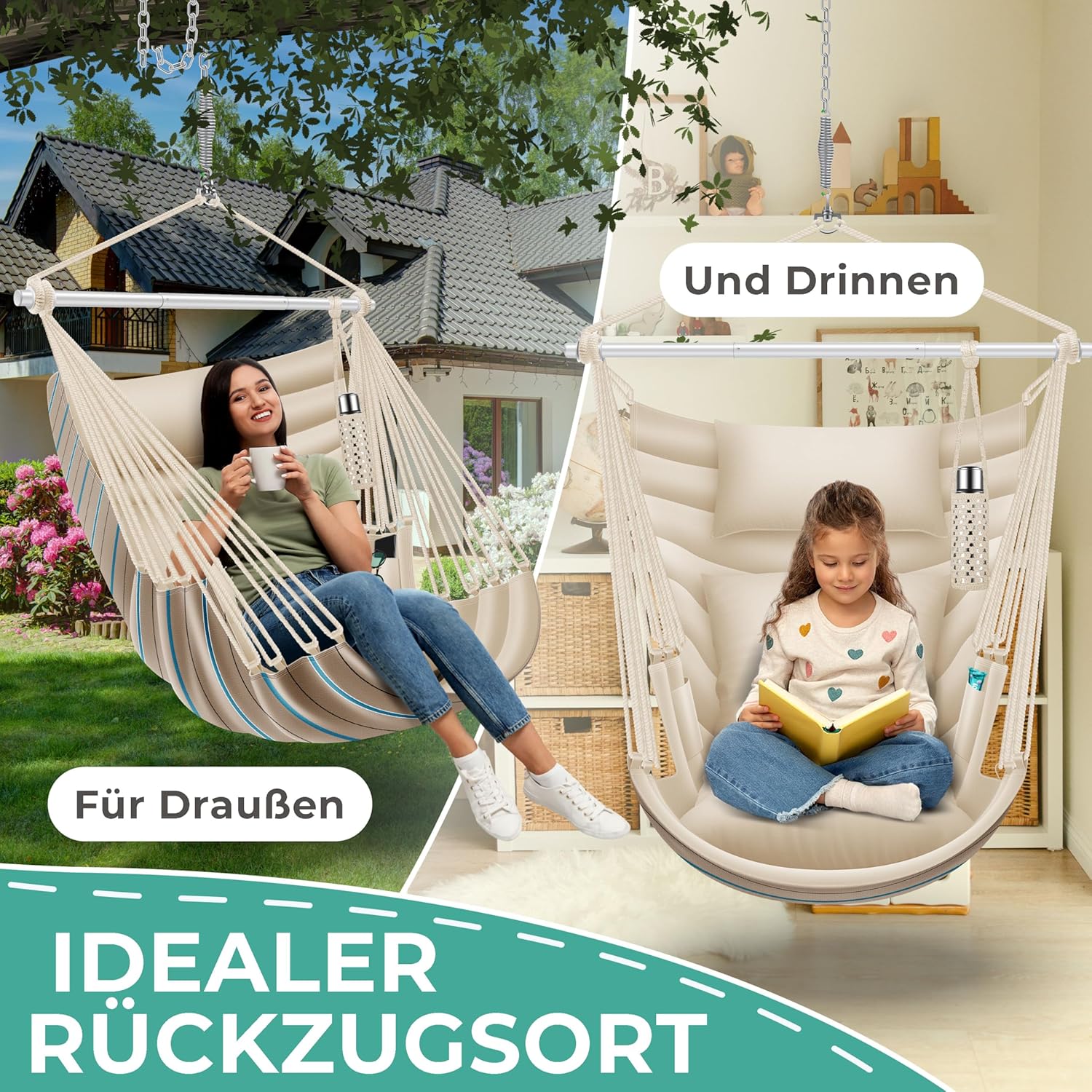 Alle metallischen Komponenten sind korrosionsbeständig beschichtet und somit auch bei Feuchtigkeit oder im Außenbereich langzeitstabil. Die Nähte und Verbindungsstellen wurden in mehrfacher Ausführung geprüft, um sicherzustellen, dass sie auch unter Dauerbelastung ihren Dienst tun. Zusätzlich wurde das Aufhängesystem so dimensioniert, dass es nicht nur das Körpergewicht, sondern auch die zusätzlichen Kräfte durch Schwing- und Drehbewegungen sicher kompensiert. So können Eltern beruhigt zusehen, wie ihre Kinder lachend im Stuhl schaukeln, und Senioren den Hängestuhl als sicheren, rückenschonenden Sitzplatz nutzen.
