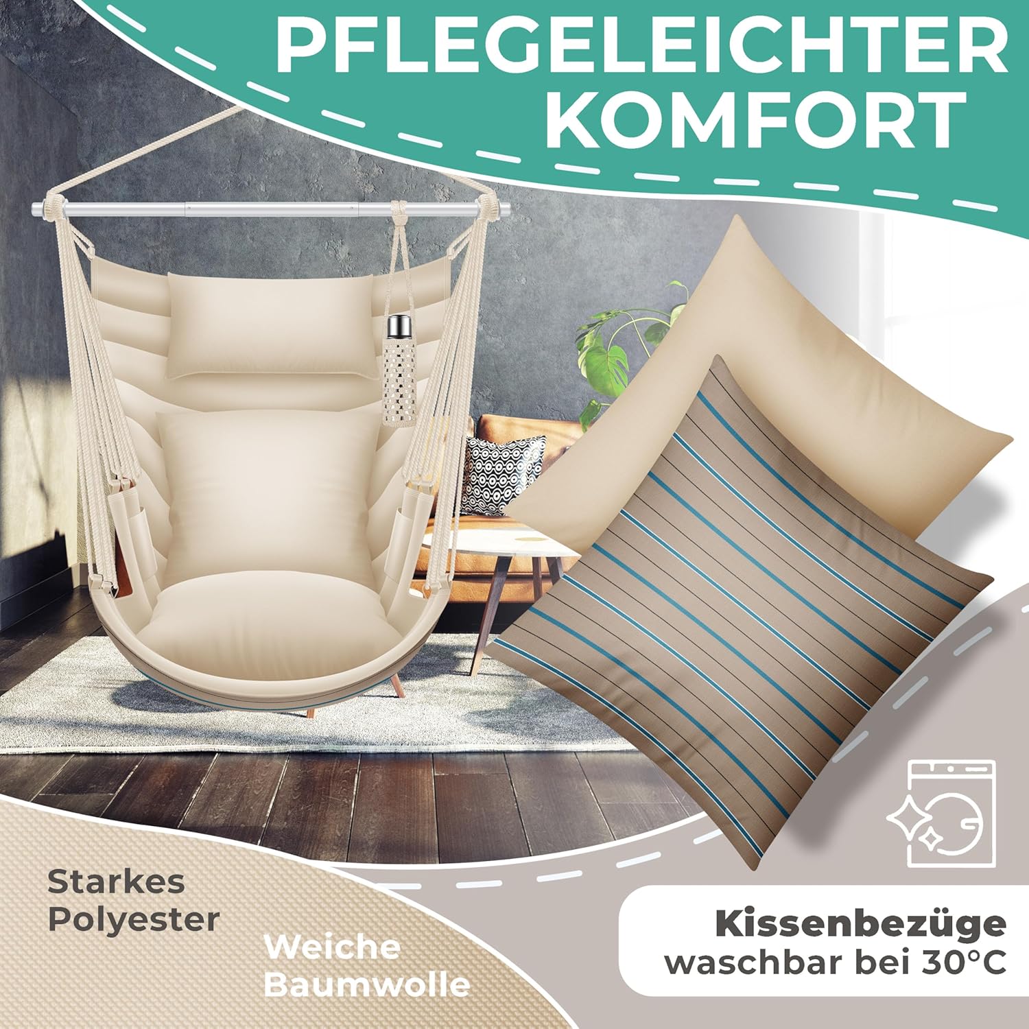 Genießen Sie das Gefühl schwebender Entspannung – jederzeit, überall. Der KESSER® Haiti Hängestuhl ist mehr als nur ein Sitzmöbel: Er ist ein Wohlfühlort, ein Rückzugsort vom Alltag, ein Ort, an dem Familie, Freunde und Individualisten gemeinsam zur Ruhe kommen. Mit seiner eleganten cappuccinofarbenen Optik und der durchdachten Premiumausstattung fügt sich dieser Hängestuhl nahtlos in jeden Wohnraum, Garten, Wintergarten oder Balkon ein. Ob Sie nach einem langen Arbeitstag die Seele baumeln lassen, ein gutes Buch lesen, sanft schaukelnd einschlafen oder mit Ihren Kindern gemeinsam die Sonne genießen – der Haiti Hängestuhl wird schnell zum Lieblingsplatz im Haus.