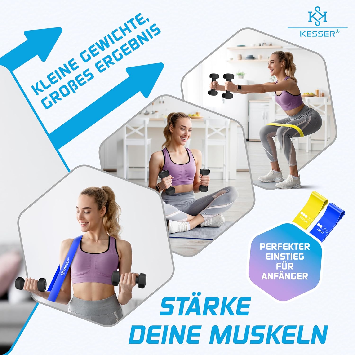 Das KESSER Hantel-Set geht über das bloße Bereitstellen von Gewichten hinaus – es liefert alles, was Sie für ein abwechslungsreiches und zielgerichtetes Training benötigen. Im Lieferumfang enthalten sind zwei hochwertige Fitnessbänder in den Widerstandsstufen „Light“ und „Extra Light“. Diese elastischen Bänder erweitern das Übungsspektrum erheblich: Sie ermöglichen zusätzliche Widerstände bei Kniebeugen, Ausfallschritten oder Rudern am Band, trainieren die Rumpfmuskulatur und unterstützen die Mobilisation der Schultergelenke.