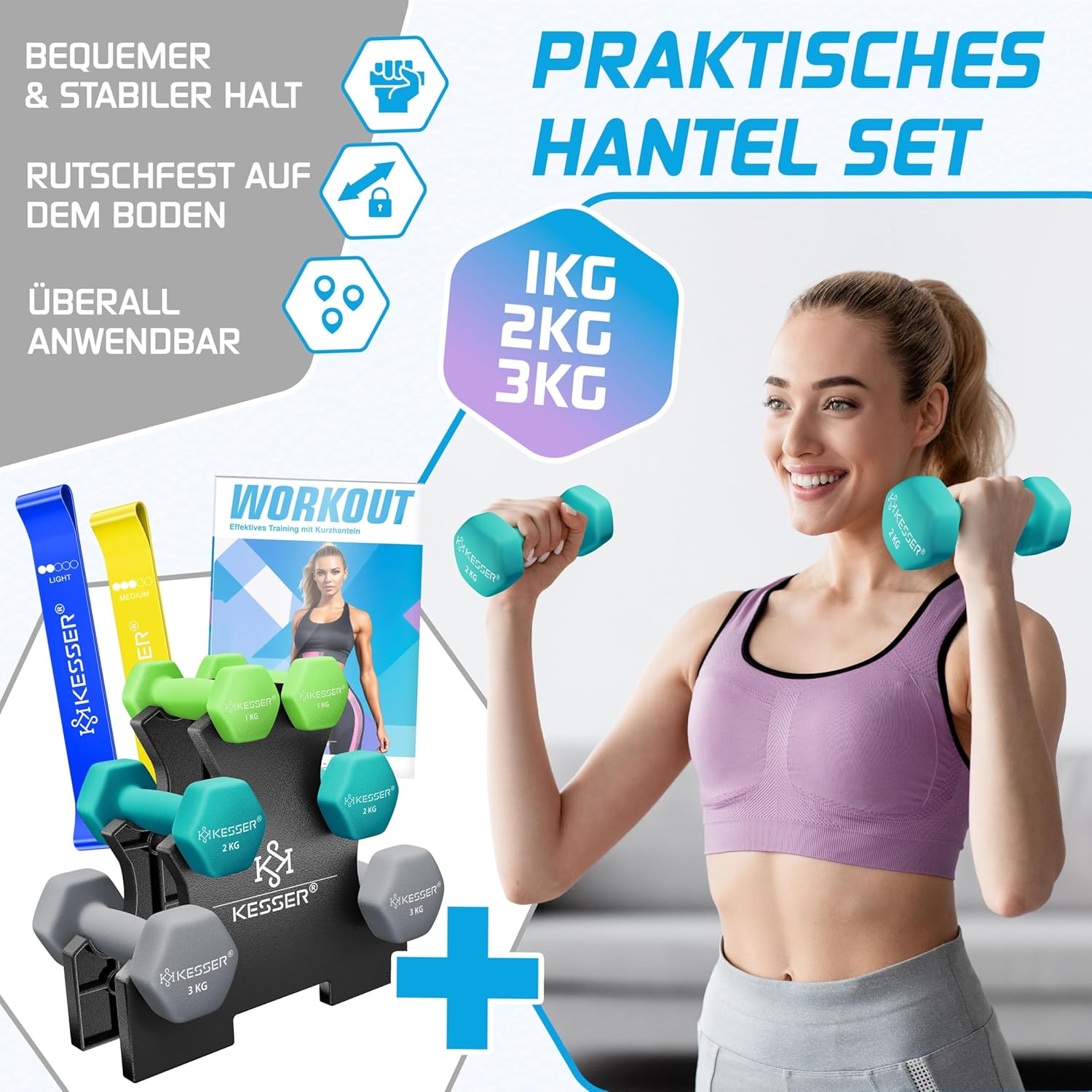 KESSER® Hantelset 3 Paare 1-5 kg mit Stand, Neopren, Anti-Rutsch, inkl. Trainingsbuch