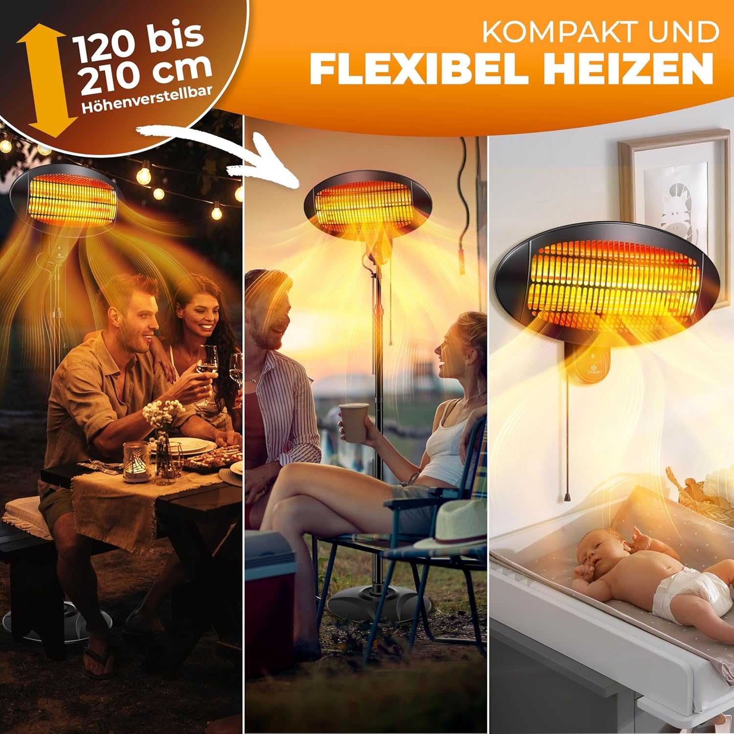 Wenn die Heizsaison vorbei ist, lässt sich das Gerät platzsparend verstauen. Die höhenverstellbare Stange kann zur Aufbewahrung abgenommen werden, und das kompakte Gehäuse passt problemlos in jeden Keller, jede Garderobe oder jedes Regal. Das geringe Eigengewicht und die robuste Bauweise machen den Heizstrahler zudem ideal für den mobilen Einsatz – ob im Ferienhaus, im Wohnwagen oder beim Camping.