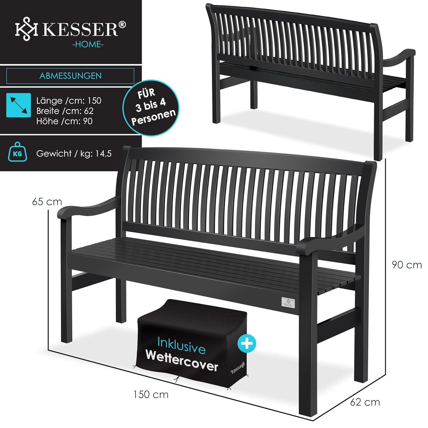KESSER® Holzbank Gartenbank 150 cm, wetterfest, 320 kg Traglast, für 3-4 Personen