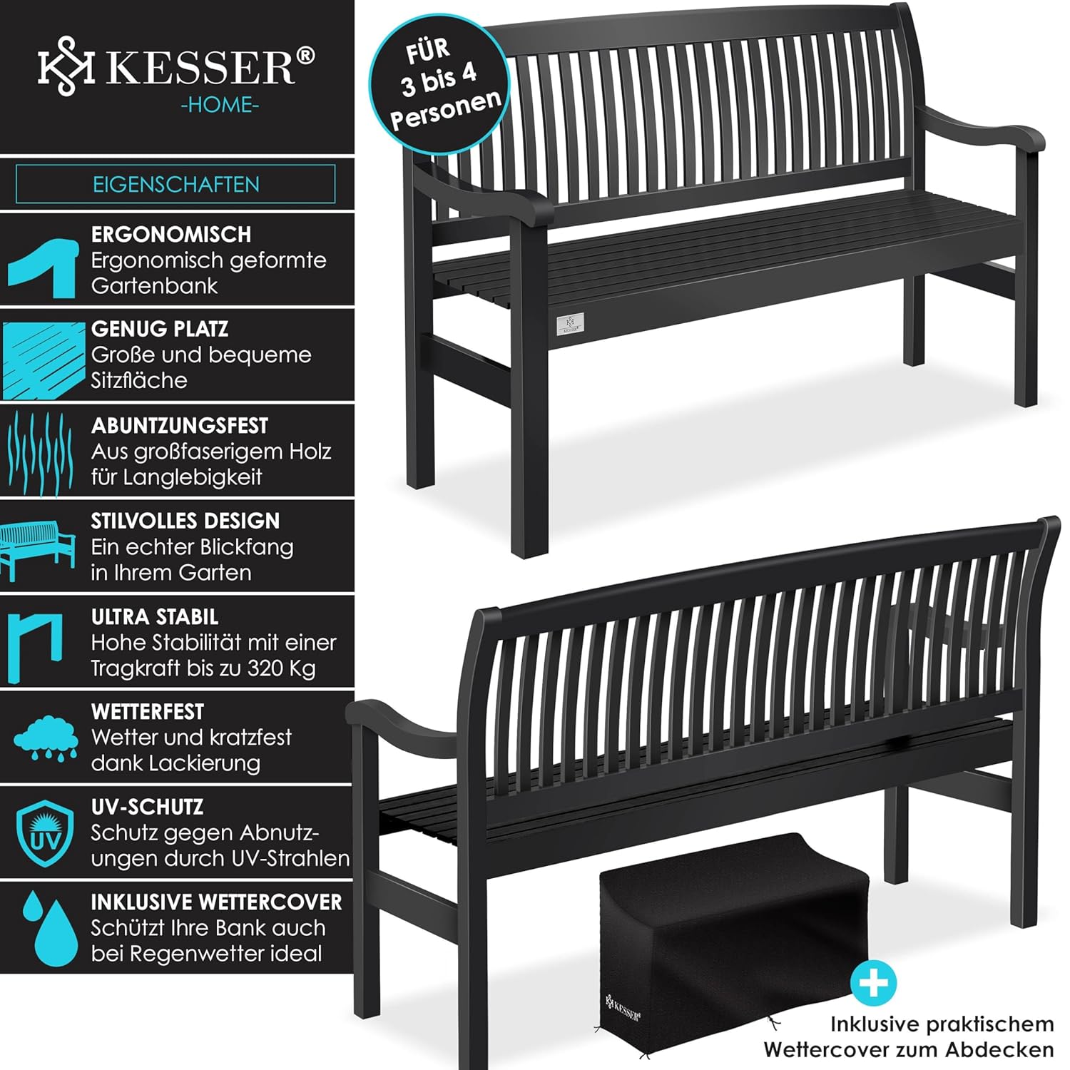 • Tragfähigkeit von bis zu 320 kg – eine der stabilsten Gartenbänke ihres Segments
