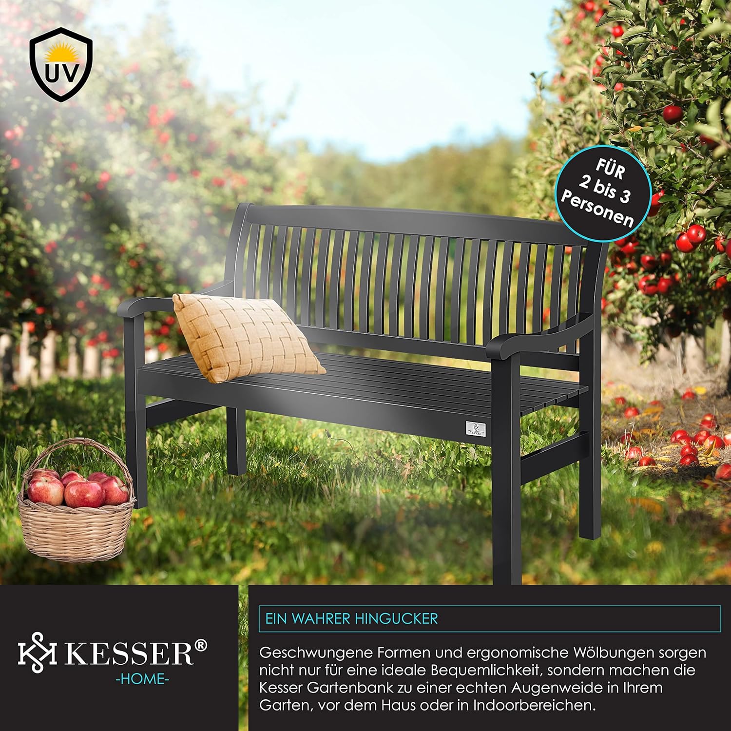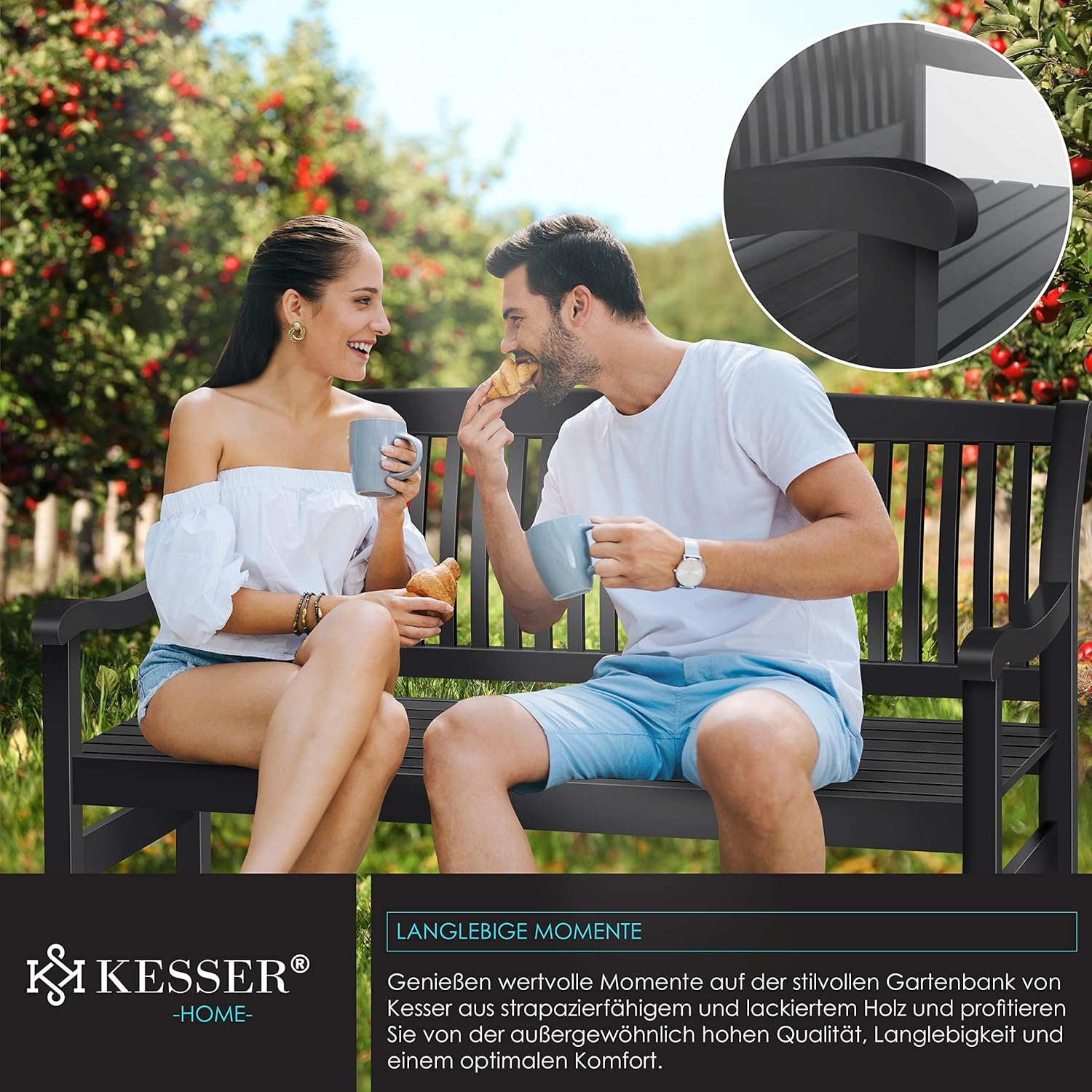 Genießen Sie die schönsten Momente des Lebens im Freien – gemeinsam mit Ihrer Familie, allein mit einem Buch in der Hand oder bei einem gemütlichen Nachmittagskaffee mit Freunden. Die KESSER® Gartenbank aus Massivholz ist mehr als nur eine Sitzgelegenheit: Sie ist ein Statement für gehobenen Wohnkomfort im Außenbereich, ein Ort der Entspannung und des Miteinanders. Mit ihrer elegant geschwungenen Form, der erstklassigen Verarbeitung und der außergewöhnlichen Belastbarkeit von bis zu 320 kg bietet diese 150 cm lange Parkbank Premium-Qualität, die Generationen begleiten wird.