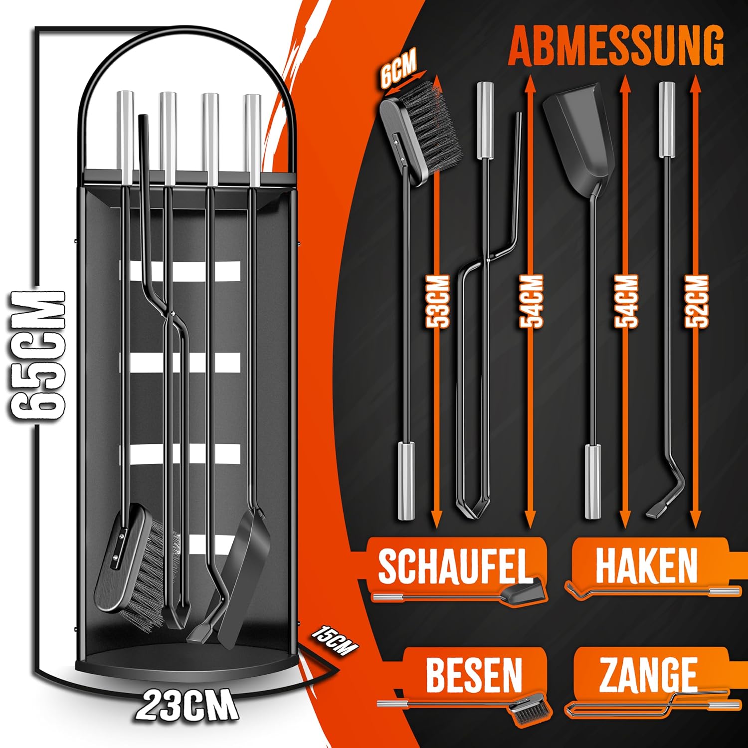 • Lieferumfang: 1 x Stand mit Sichtschutz, 1 x Kaminbürste, 1 x Ascheschaufel, 1 x Kaminhaken (Poker), 1 x Zange