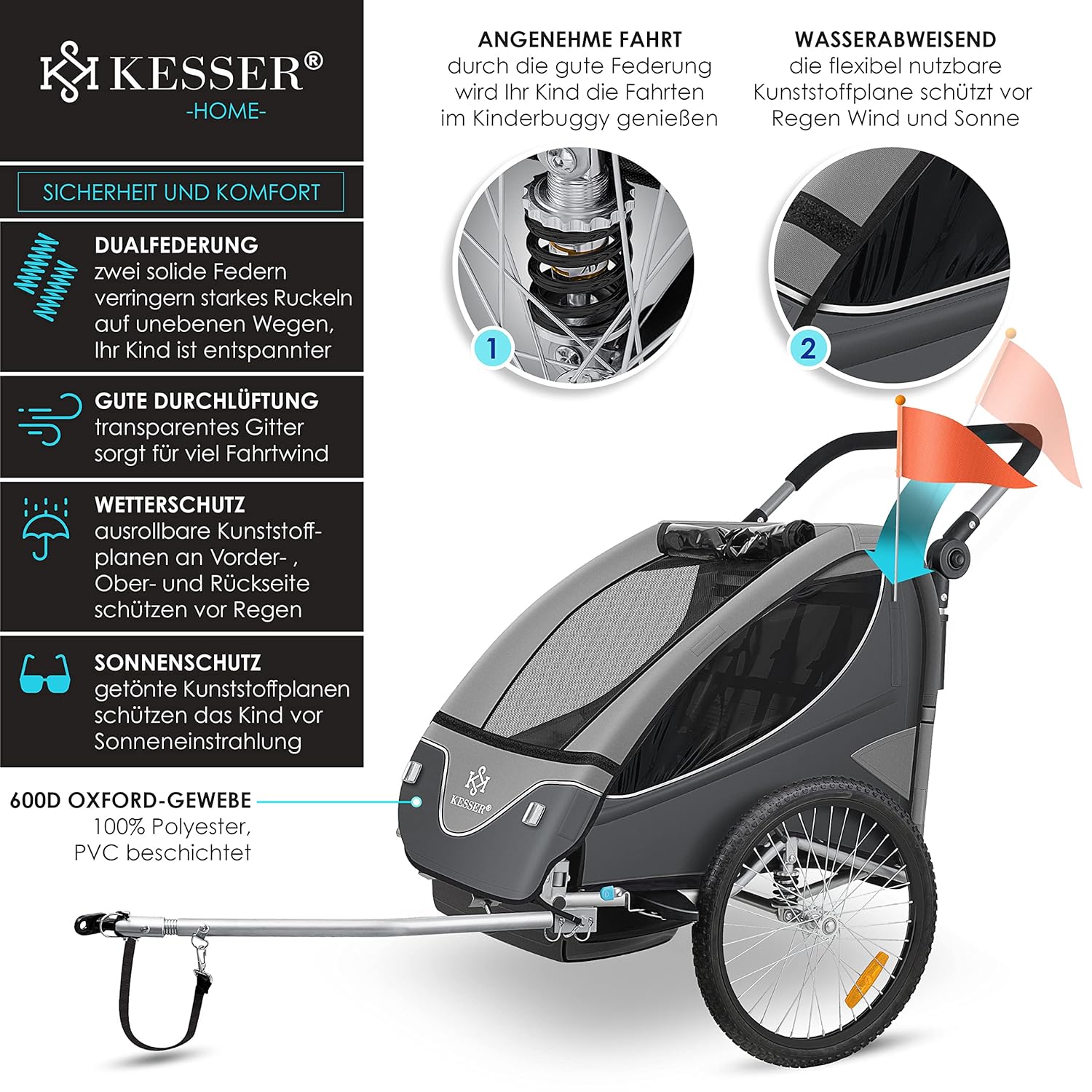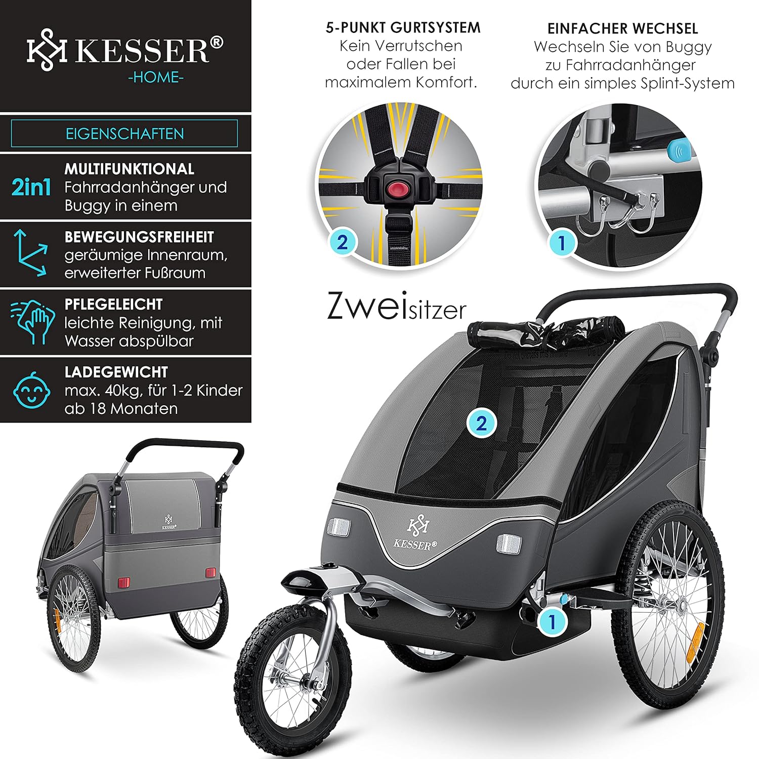 Entdecken Sie den Kesser® Kinderanhänger – ein Meisterwerk moderner Familientechnik, das Sicherheit, Komfort und Flexibilität in einem sportlich-eleganten Design vereint. Egal, ob Sie mit Ihren Kindern zum Bäcker fahren, den Wochenendausflug zum See planen oder das Fahrrad für den Alltag mit der Familie nutzen – dieser 2-in-1 Jogger-Kinderanhänger ist der zuverlässige Partner, auf den Sie sich jederzeit verlassen können. Mit durchdachten Details, hochwertigen Materialien und einer cleveren Konstruktion, die keine Wünsche offenlässt, setzt dieser Anhänger neue Maßstäbe im Bereich mobiler Familienmobilität.
