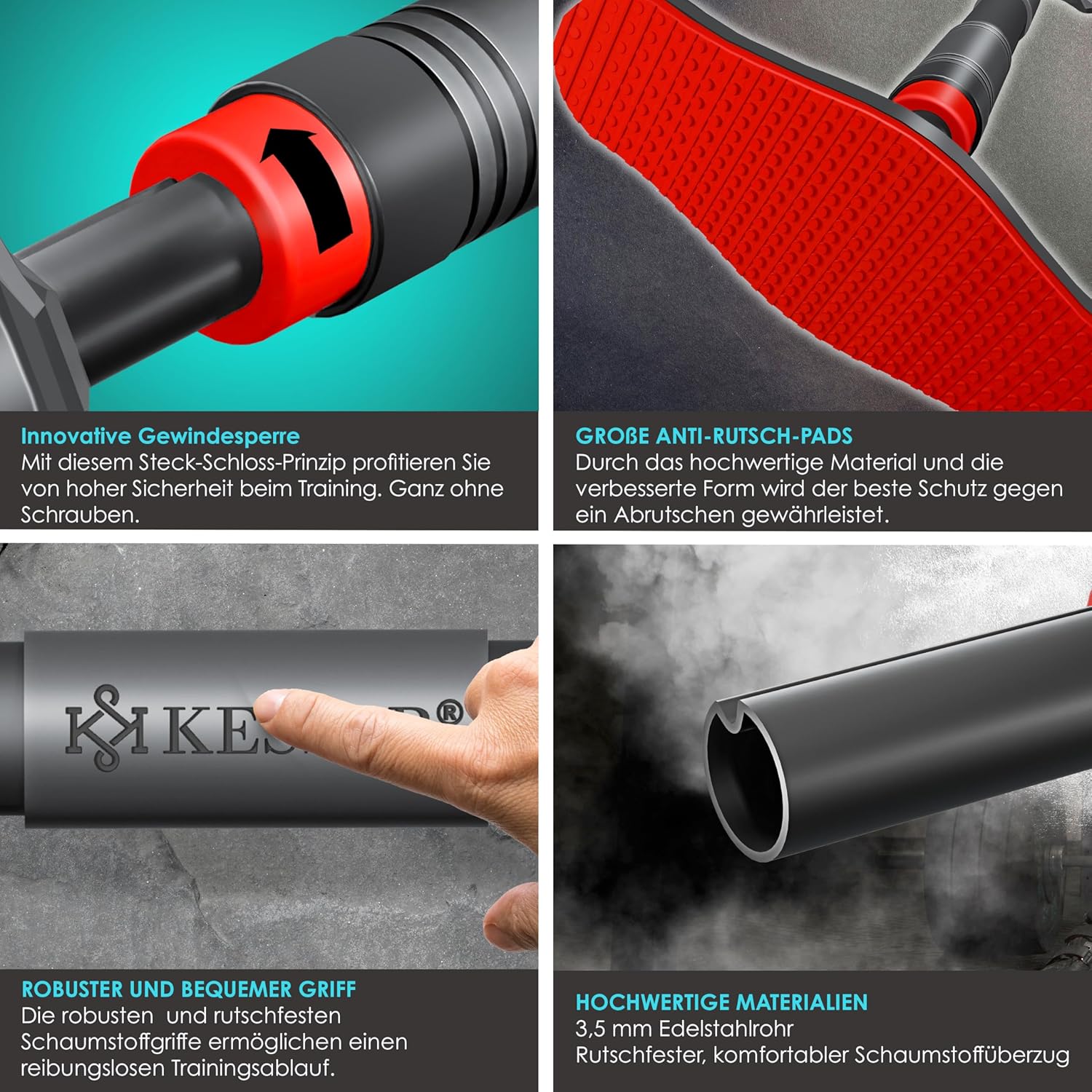 - Material: Edelstahl, hochdichter Schaumstoff, Latex-Widerstandsbänder