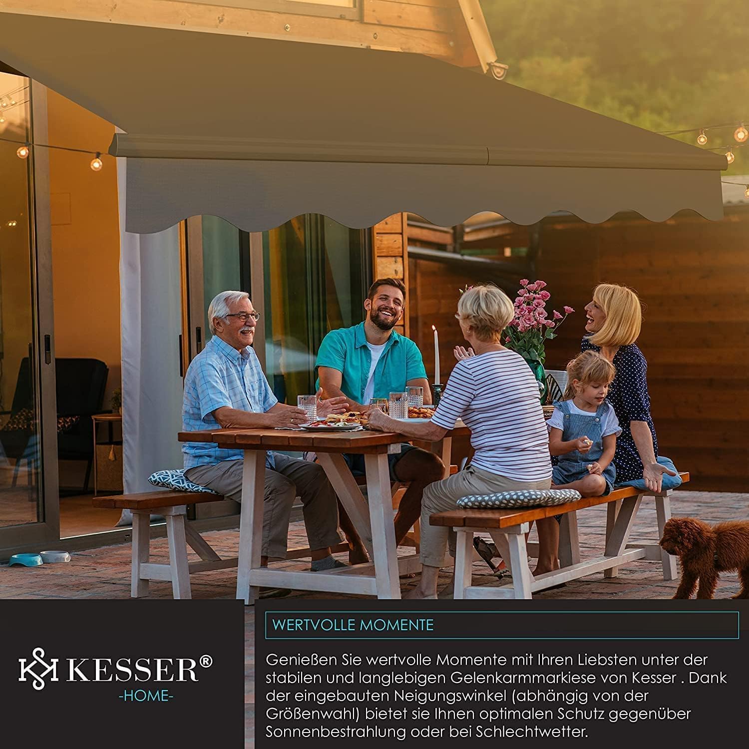 Ein gemütlicher Sonntagnachmittag mit der Familie auf der Terrasse, ein intimes Abendessen zu zweit im goldenen Licht der untergehenden Sonne oder ein ausgelassenes Grillfest mit Freunden – solche Momente verdienen den perfekten Rahmen. Der KESSER® Articulated Arm Awning in den Maßen 300 x 250 cm schafft diesen Rahmen: eine elegante, langlebige und hochfunktionale Markise, die nicht nur optimalen Sonnen- und Wetterschutz bietet, sondern auch stilistisch jedes Ambiente bereichert. Mit seiner innovativen Technik, hochwertigen Materialien und durchdachten Details ist dieser Klemm-Markisen-Aufsatz die ideale Lösung für alle, die Wert auf Komfort, Langlebigkeit und zeitloses Design legen.