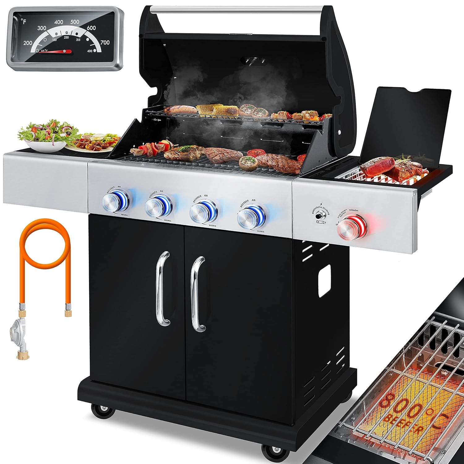 • Brennertyp: 4 Hauptbrenner + 1 Keramik-Infrarot-Seitenbrenner