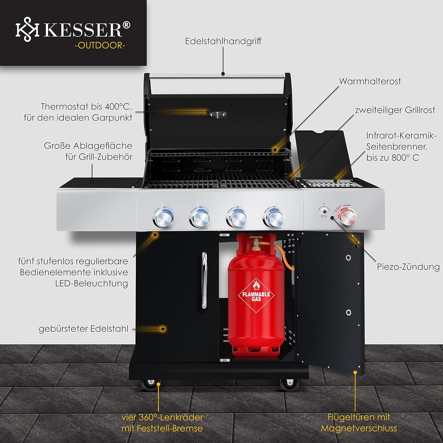 KESSER® Master BBQ Gasgrill mit 800°C Infrarot, 4+1 Keramikbrennern, LED-Beleuchtung