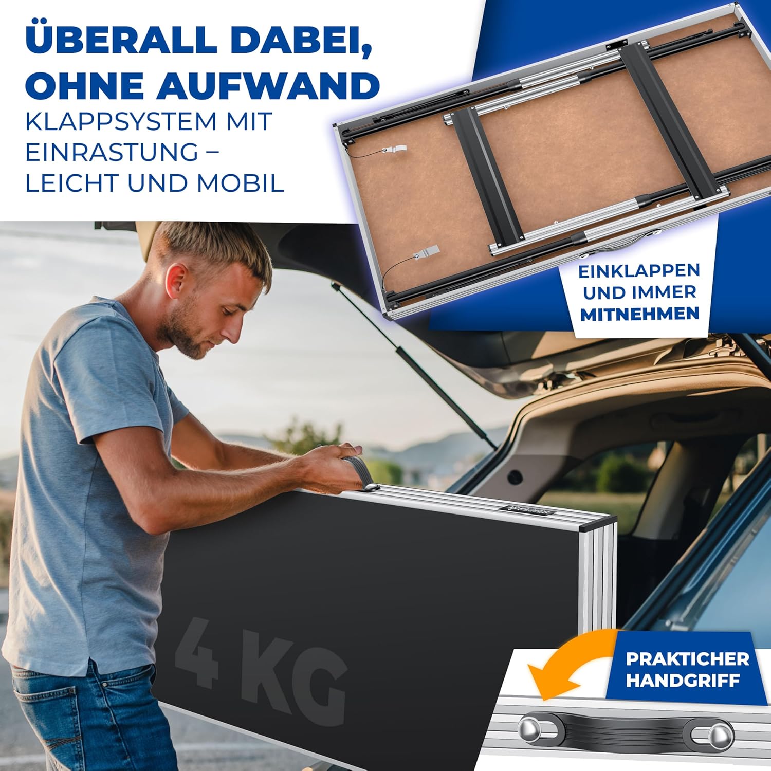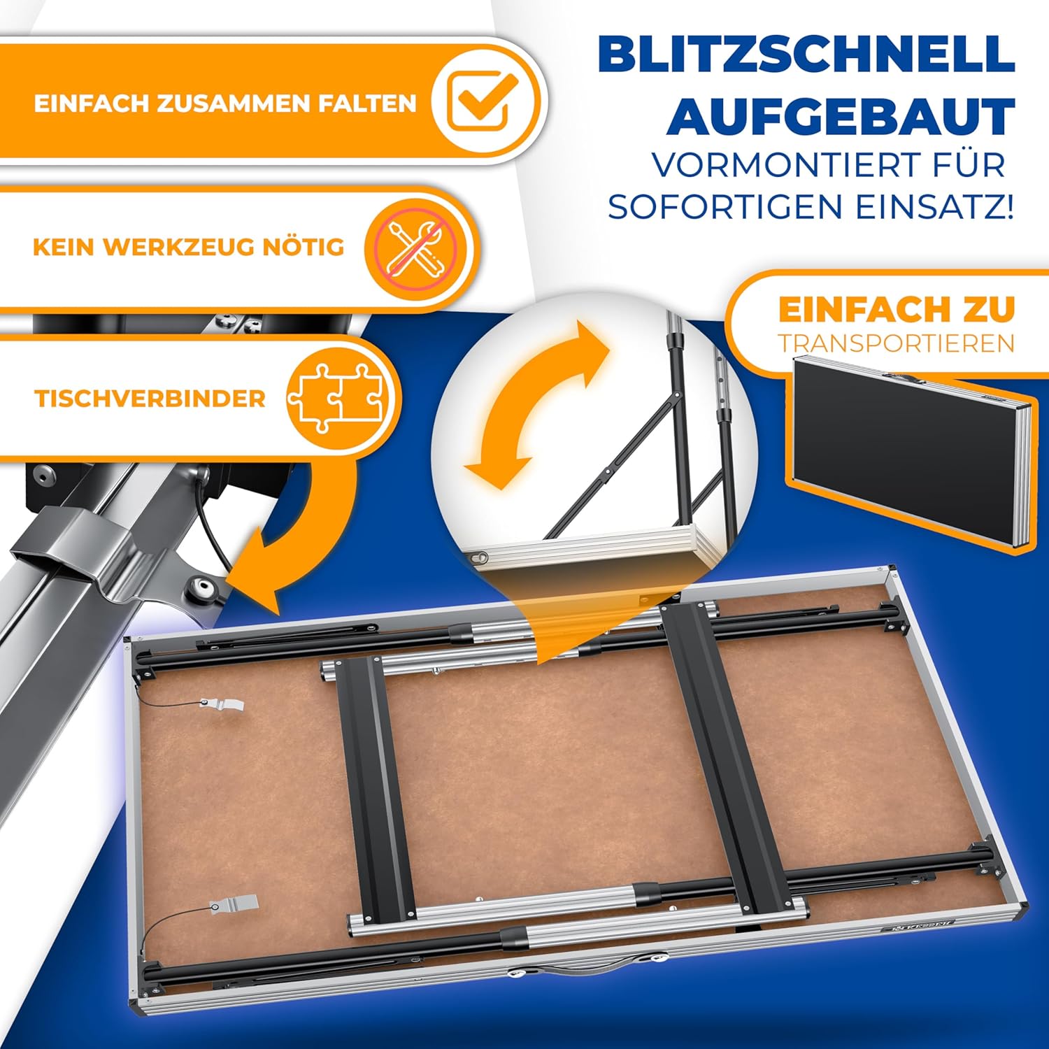 Dank des raffinierten Faltmechanismus lassen sie sich in Sekundenschnelle zusammenklappen und platzsparend verstauen. Ausgeklappt steht der Tisch innerhalb von 10 Sekunden stabil und sicher – ideal für spontane Einsätze oder kurze Marktauftritte. Die integrierten Tragegriffe erleichtern den Transport zusätzlich und sorgen dafür, dass Sie den Tisch auch allein problemlos bewegen können.