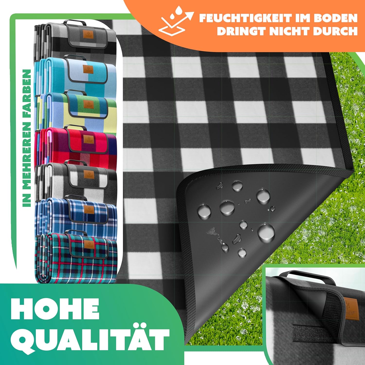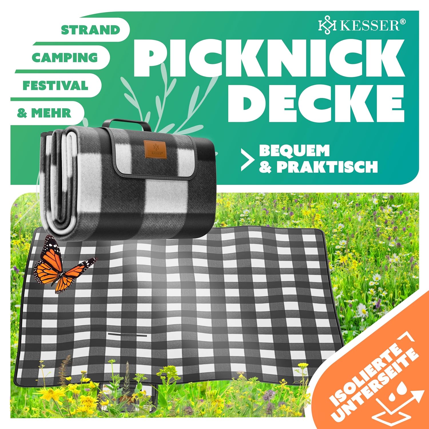 - 1x KESSER® Picknickdecke XXL (200 x 200 cm) in Schwarz/Weiß