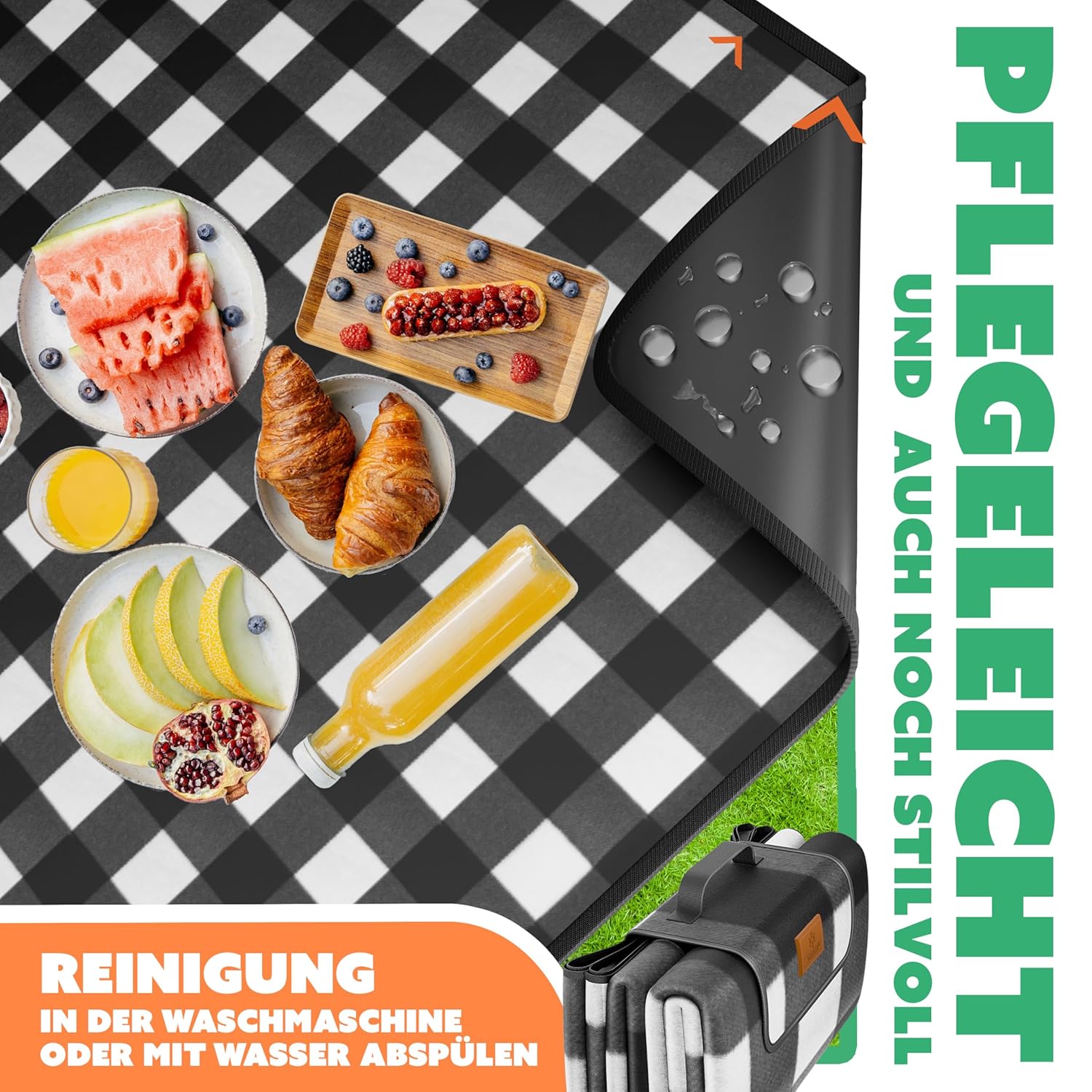 Die Decke ist außerdem resistent gegen Schmutz, Flecken und Verschütten. Ob Saft, Wein oder Picknicksauce – die meisten Flüssigkeiten lassen sich einfach mit einem Tuch abwischen. Kein Einweichen, kein Waschen in der Maschine nötig. Für intensivere Reinigung reicht ein feuchter Lappen mit etwas milde Seife – die Materialien sind robust genug, um auch häufige Reinigung zu überstehen, ohne an Qualität zu verlieren.