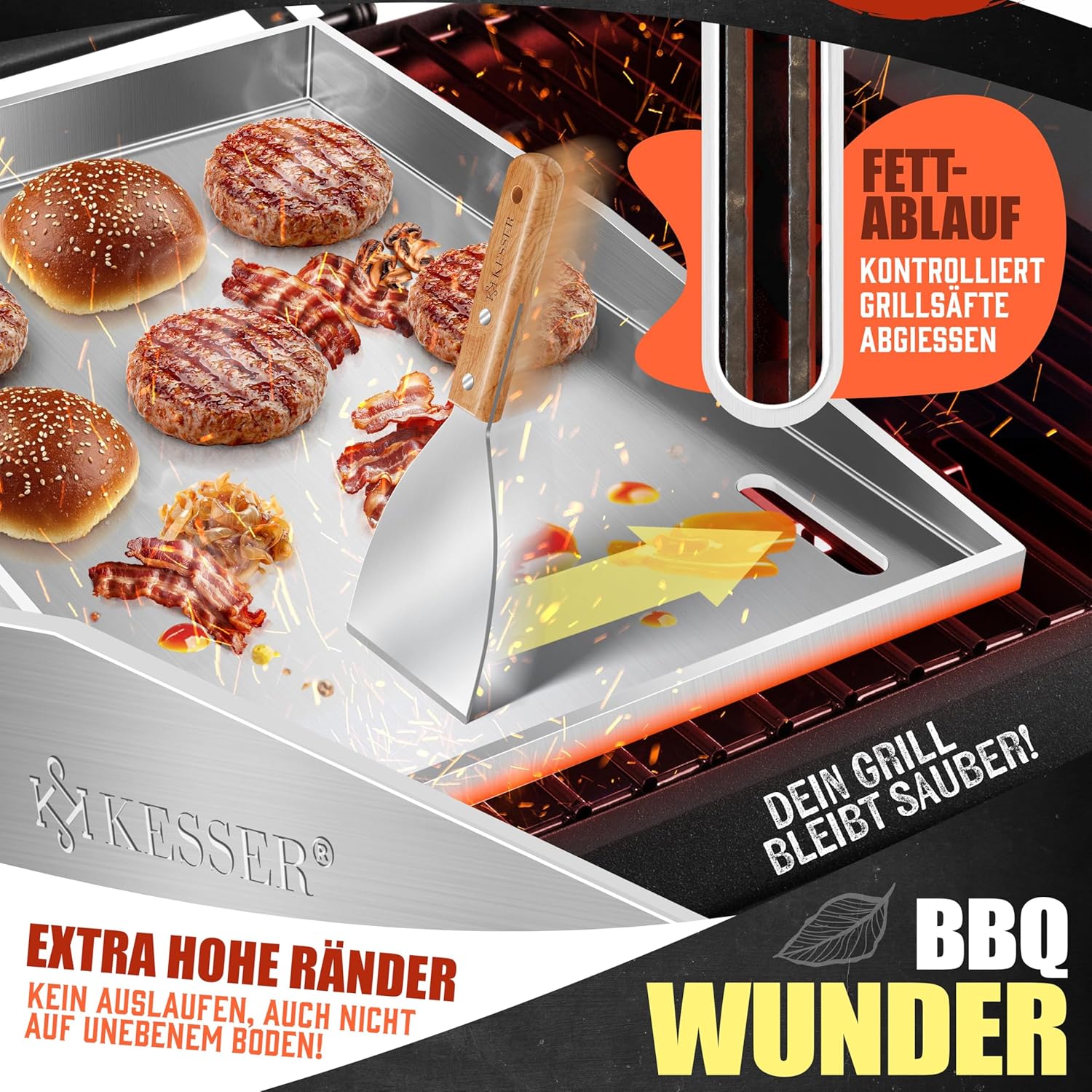 Die hohen Seitenwände schützen nicht nur vor Auslaufen, sondern bieten auch einen sicheren Rand beim Wenden und Schaben. Besonders beim Zubereiten von Smashburgern oder empfindlichen Fischfilets gibt dies ein Gefühl von Kontrolle und Stabilität. Die Platte liegt formschlüssig auf dem Grillrost auf und verrutscht nicht – unabhängig davon, ob Sie einen Gasgrill, Kugelgrill oder Schwenkgrill verwenden.