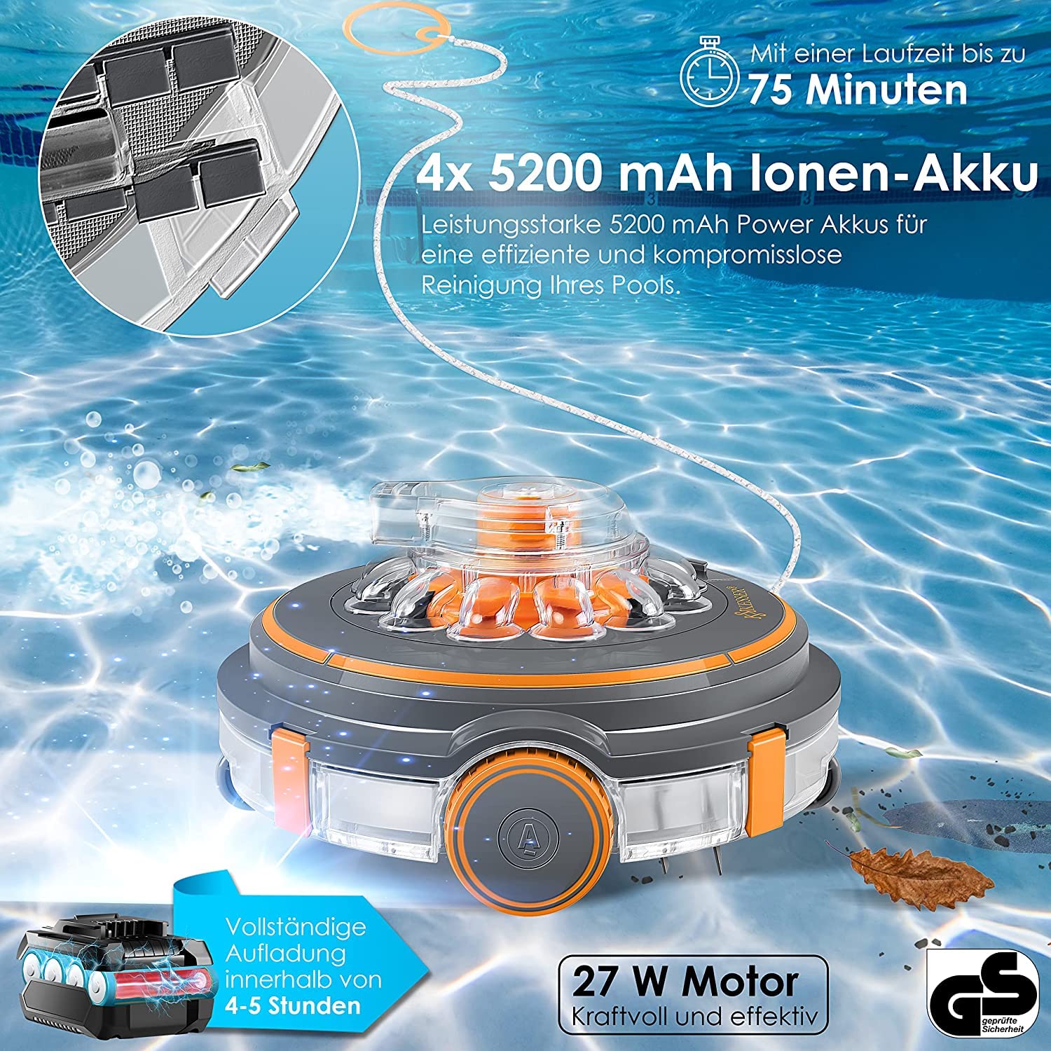 Besonders praktisch: Der Roboter ist sofort einsatzbereit. Der passende Ladegerät liegt bei, sodass Sie den Aqua-9000 direkt nach dem Auspacken aufladen und zum ersten Mal im Pool einsetzen können. Die intuitive Handhabung macht ihn auch für Senioren oder technikschwache Nutzer ideal – kein technisches Vorwissen erforderlich, nur der Wunsch nach sauberem Wasser.