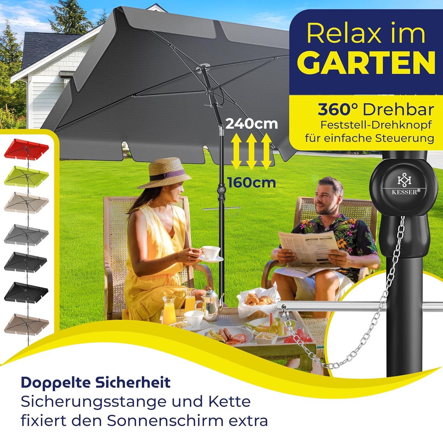 Der KESSER® Rechteck-Parasol ist mehr als ein Accessoire – er ist ein Investition in erholsame Stunden im Freien, in gemeinsame Mahlzeiten unter blauem Himmel und in die Sicherheit Ihrer Familie. Mit seiner durchdachten Technik, der hochwertigen Verarbeitung und dem zeitlosen Design wird er zum festen Bestandteil Ihres Outdoor-Lebensraums – Jahr für Jahr.