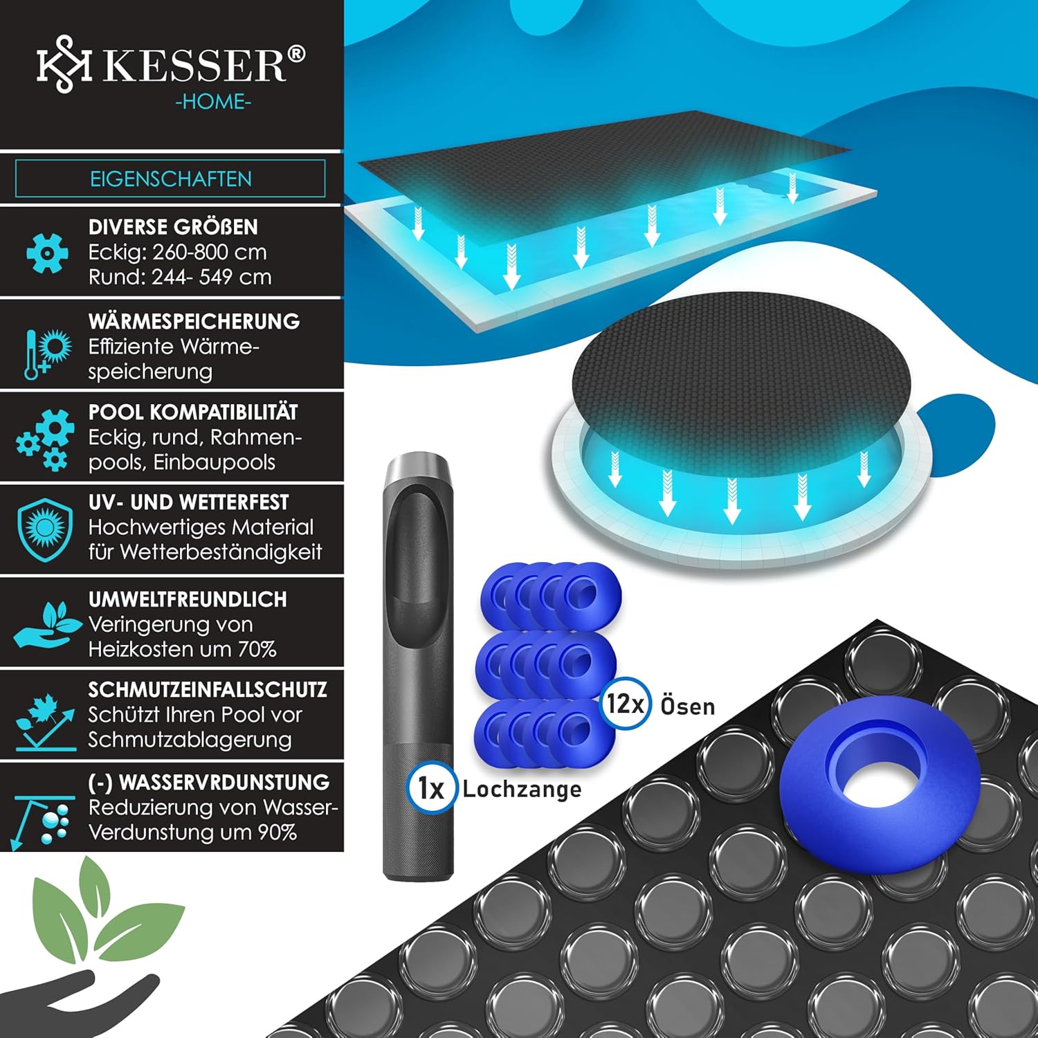 Hergestellt aus hochwertigem, UV- und chlorbeständigem Kunststoff mit einer Materialstärke von 120 µm, ist diese Abdeckung nicht nur extrem robust, sondern auch platzsparend verstaubar. Dank ihrer innovativen Oberflächenstruktur wird Sonnenenergie gezielt in Wärme umgewandelt und an das Poolwasser abgegeben – ganz ohne Strom, ohne komplizierte Technik und ohne zusätzliche Betriebskosten. Die KESSER® Pool Solar Tarpaulin ist mehr als nur ein Accessoire: sie ist eine clevere Investition in Komfort, Nachhaltigkeit und Familienfreude.