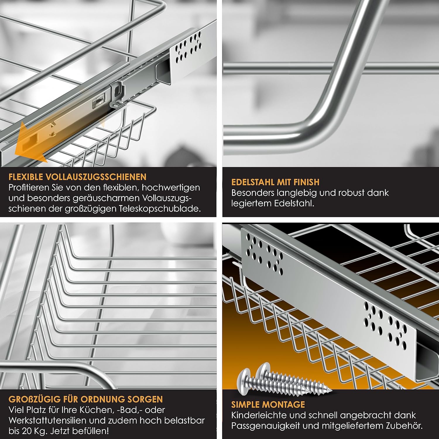 Hergestellt aus hochwertig verchromtem Stahl und mit einem Tragevermögen von bis zu 20 kg pro Fach, vereint das KESSER® Teleskop-Auszugfach Robustheit mit Eleganz. Jede Bewegung gleitet nahezu schwerelos, jede Entnahme ist ein Akt der Selbstverständlichkeit. Es ist mehr als ein Aufbewahrungssystem – es ist ein Upgrade Ihres Küchenalltags.