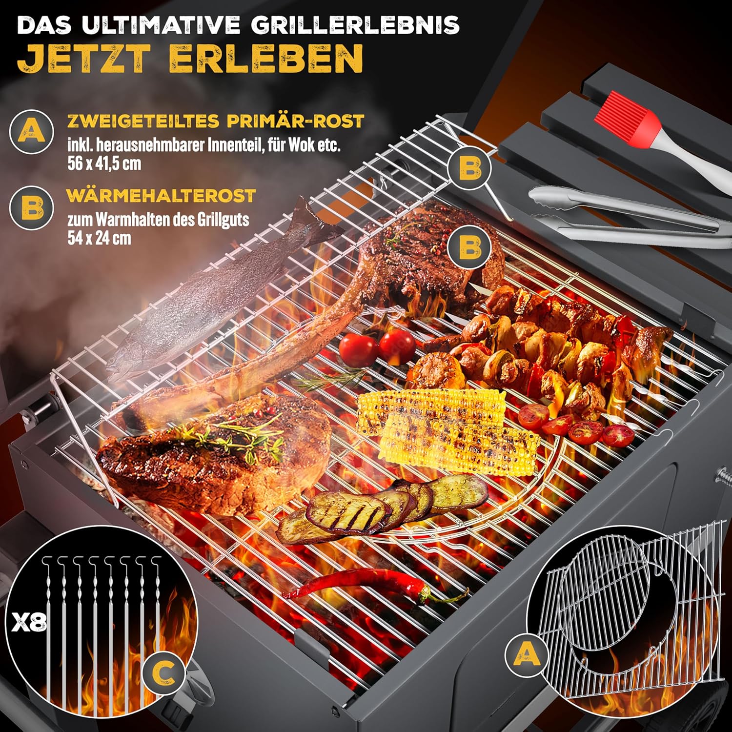 Besonders überzeugend ist die modulare Nutzung des Grillrostes. Durch den herausnehmbaren Rosteinsatz können Sie nicht nur klassisch grillen, sondern auch indirekt garen, räuchern oder mit Spezialrosten arbeiten – perfekt für anspruchsvolle Grillkünstler, die ihre Fähigkeiten erweitern möchten. Ob marinierte Hähnchenteile, zartes Gemüse oder selbstgemachte Burger – dieser Grill meistert jede Herausforderung mit Bravour.